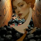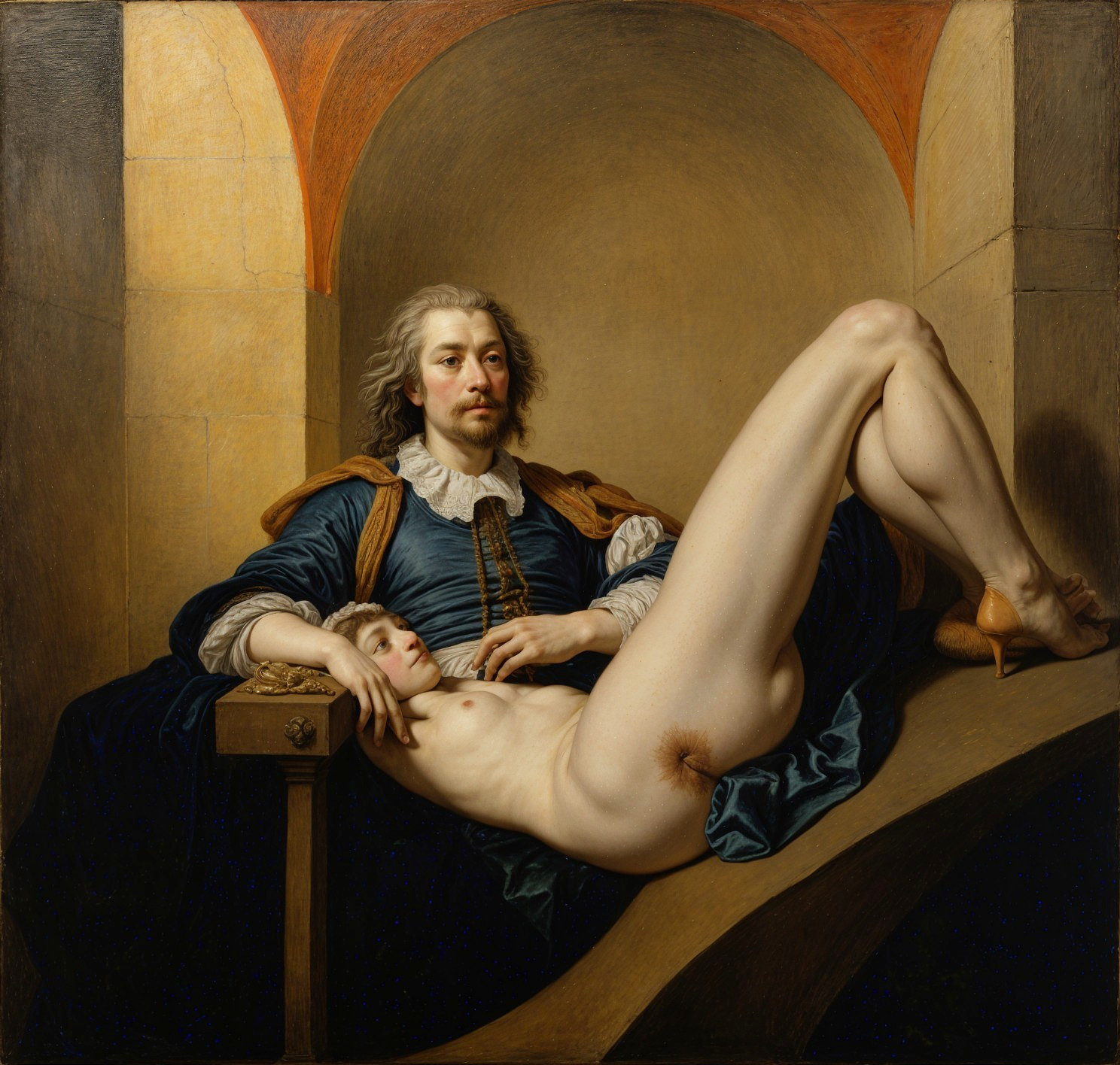 A highly detailed Rococo-style painting depicts a young man with light brown curly hair and a mustache and beard, wearing a blue shirt with gold accents and a brown cloak, lying on his side with his right arm bent behind his head and his left elbow resting on a small, dark wooden table.(◠‿◕)
