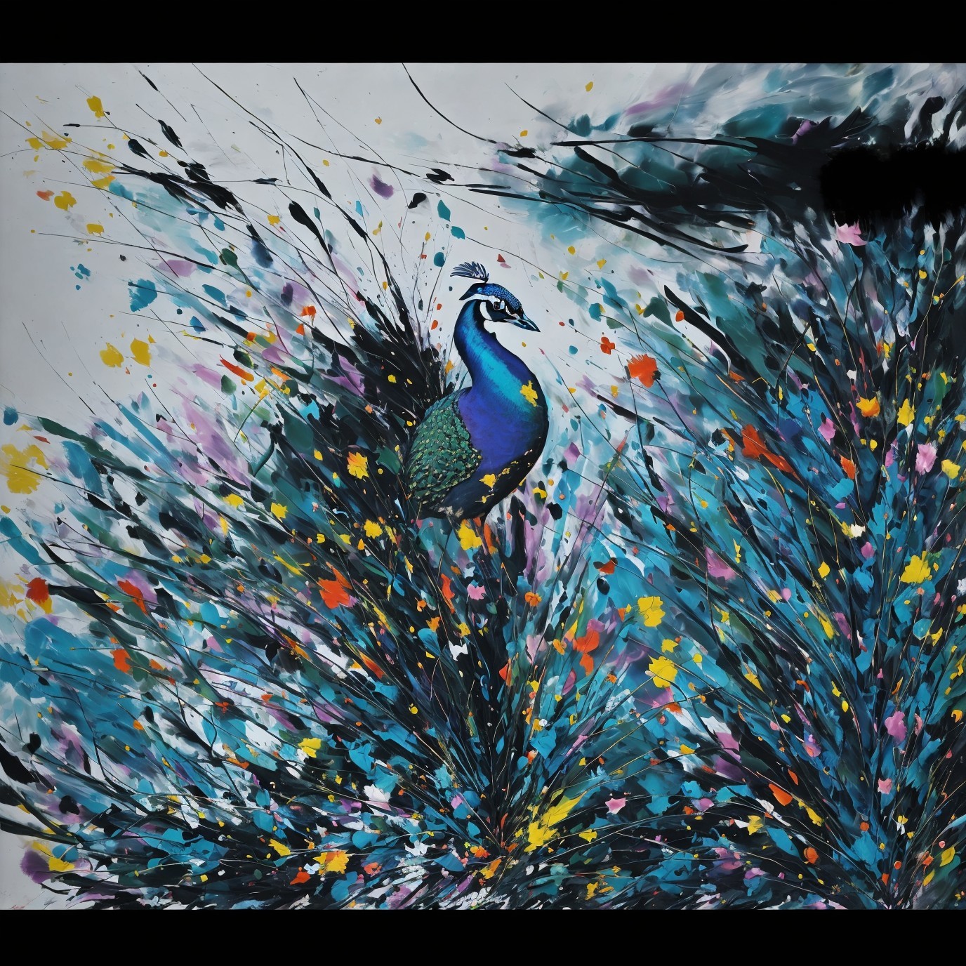 A vibrant peacock with an open tail among colorful flowers stands next to a black umbrella; an artistic, whimsical scene.