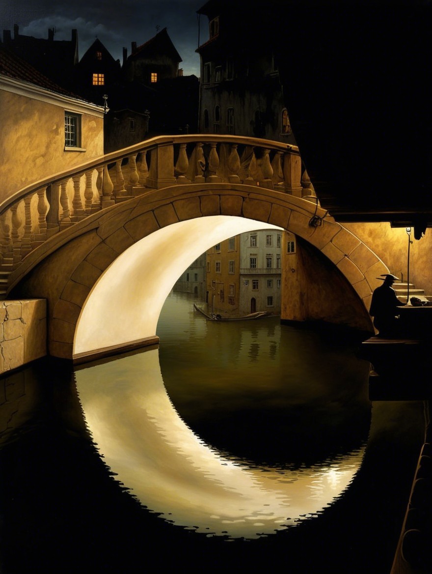 The artwork features a surreal landscape with an arching bridge, reflecting golden hues on calm water. Silhouetted figures stand beneath, complemented by a distant house and serene atmosphere.