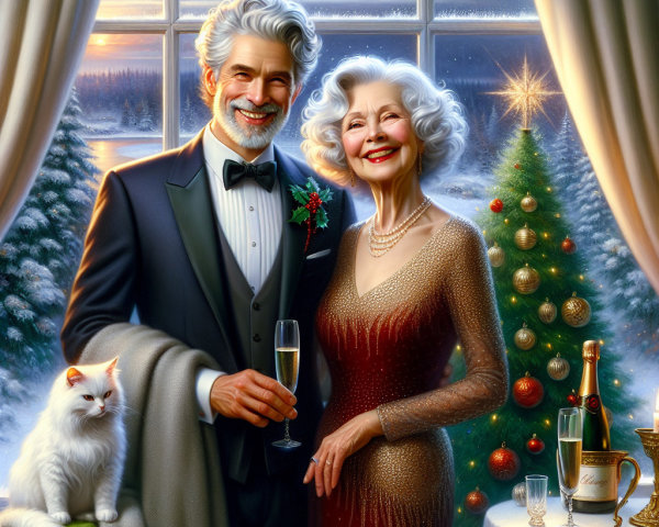 A serene, colorful landscape features two figures gazing at a cosmic scene filled with planets and stars, surrounded by vibrant trees and flowers in a magical, dreamlike setting.