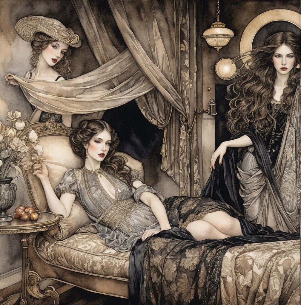 A woman lounges among luxurious bed linens, her flowing hair cascading over soft pillows. She gazes thoughtfully, exuding a sense of elegance and allure in muted, rich tones.