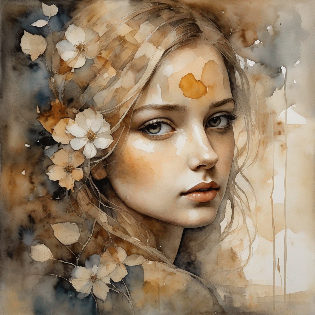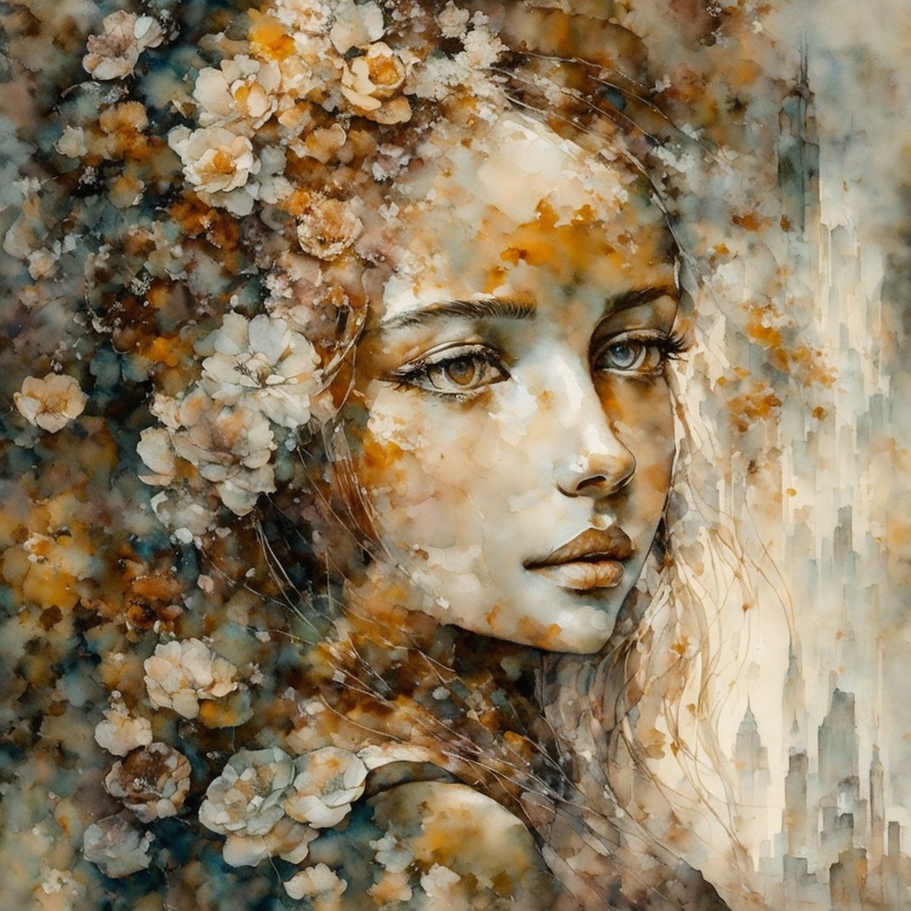 A portrait of a woman with a serene expression, adorned with flowers, in a warm, watercolor style with earth tones.