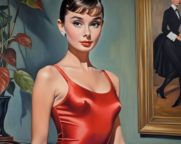 A woman in a luxurious blue and gold leotard sits elegantly in an opulent, historical room, adorned with ornate decorations and soft lighting, exuding charm and sophistication.