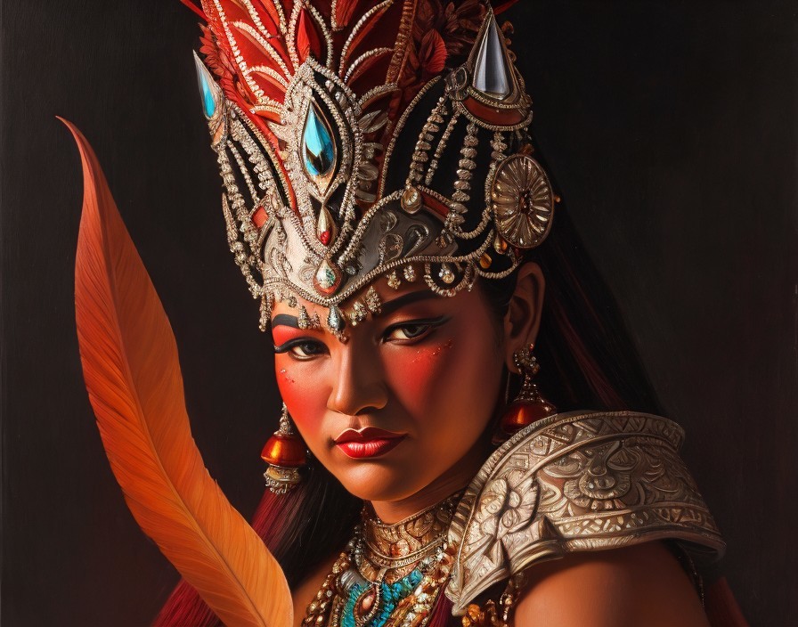 An ornately adorned figure with a majestic headdress, set against a background of vibrant, tropical leaves.