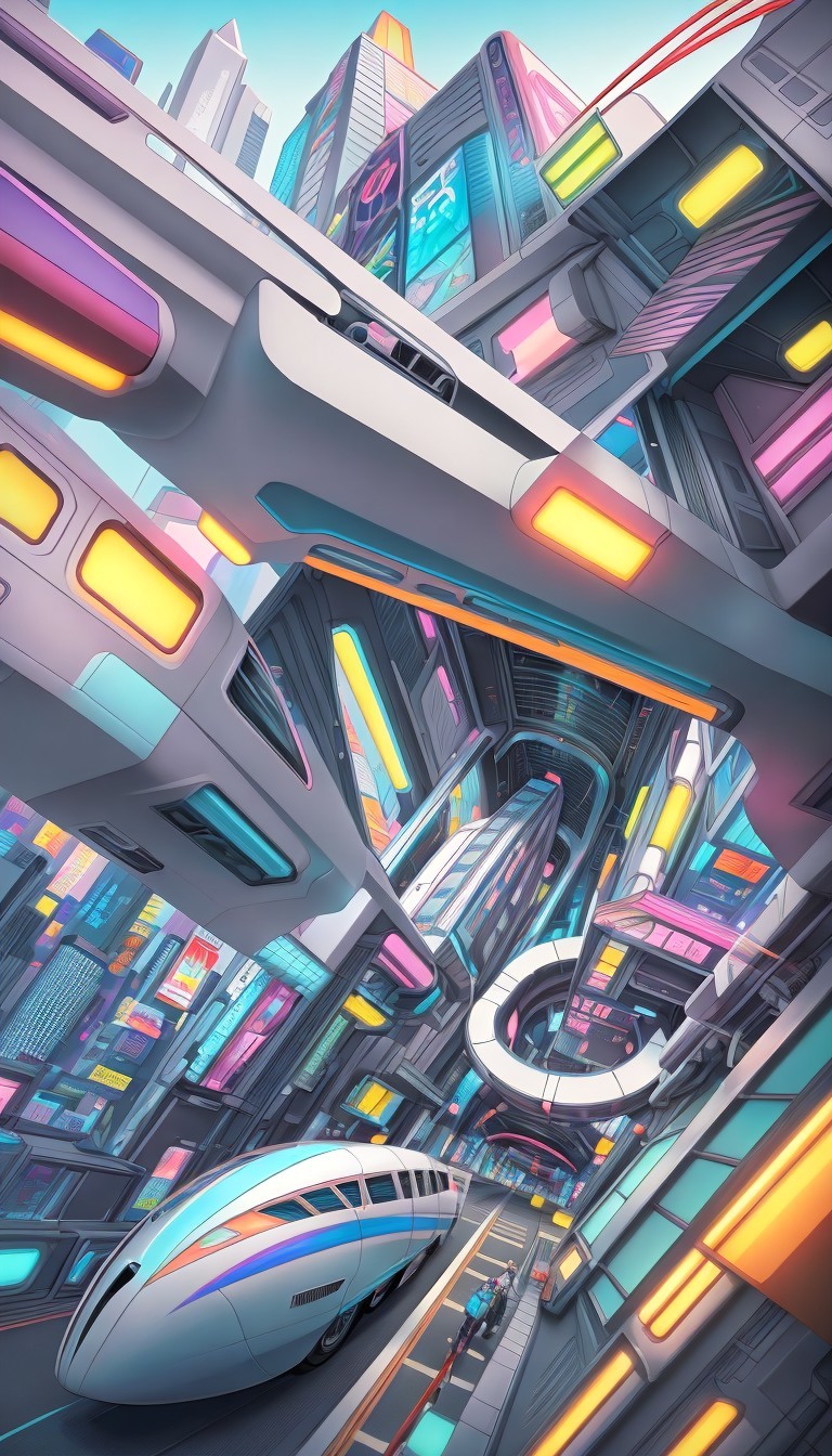 A futuristic cityscape with vibrant neon lights and towering skyscrapers. A sleek, white car navigates through elevated tracks, surrounded by colorful advertisements and a bustling atmosphere.