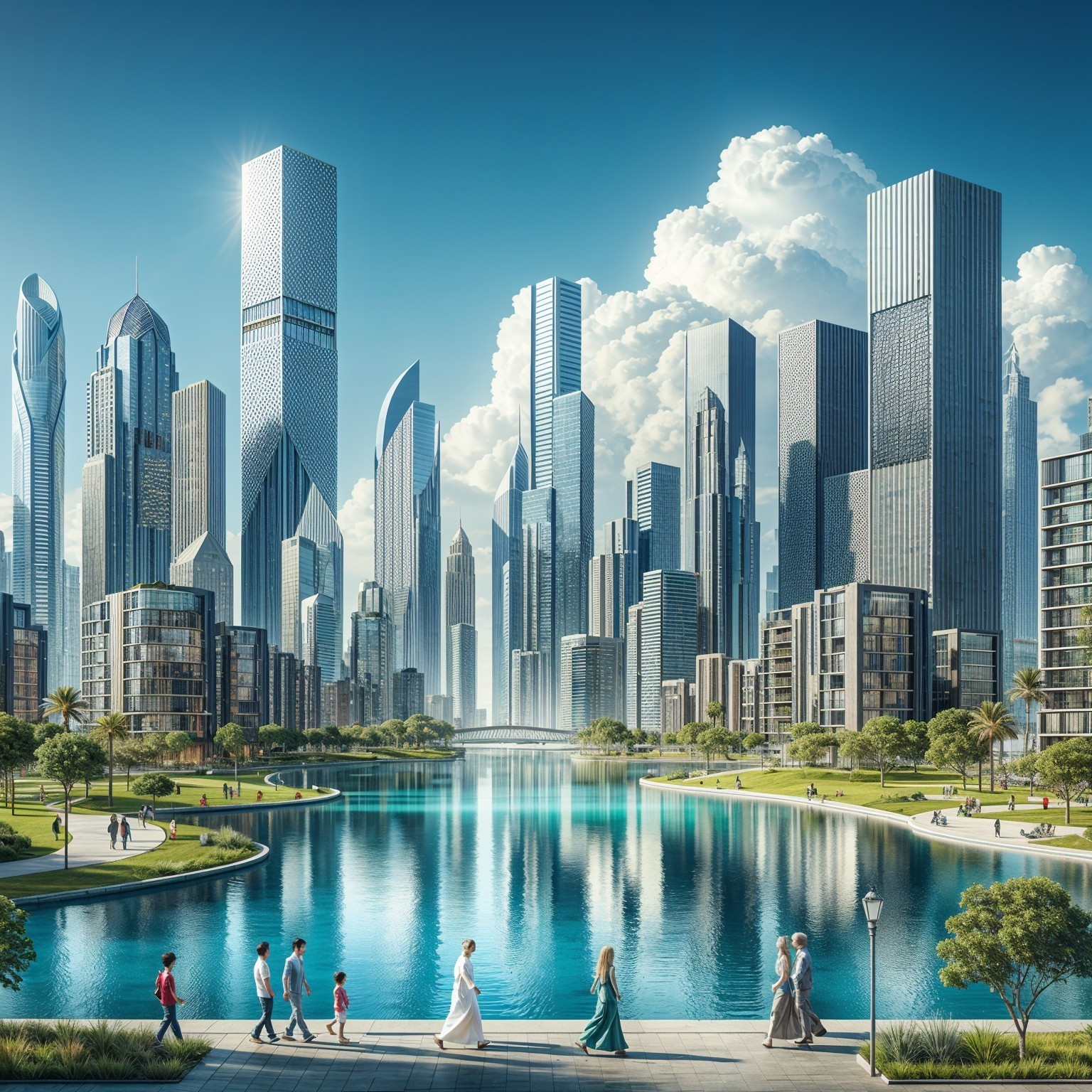 A futuristic cityscape features sleek, organic building designs with flowing shapes. People stroll along a path beside a serene water feature, surrounded by greenery and modern skyscrapers.