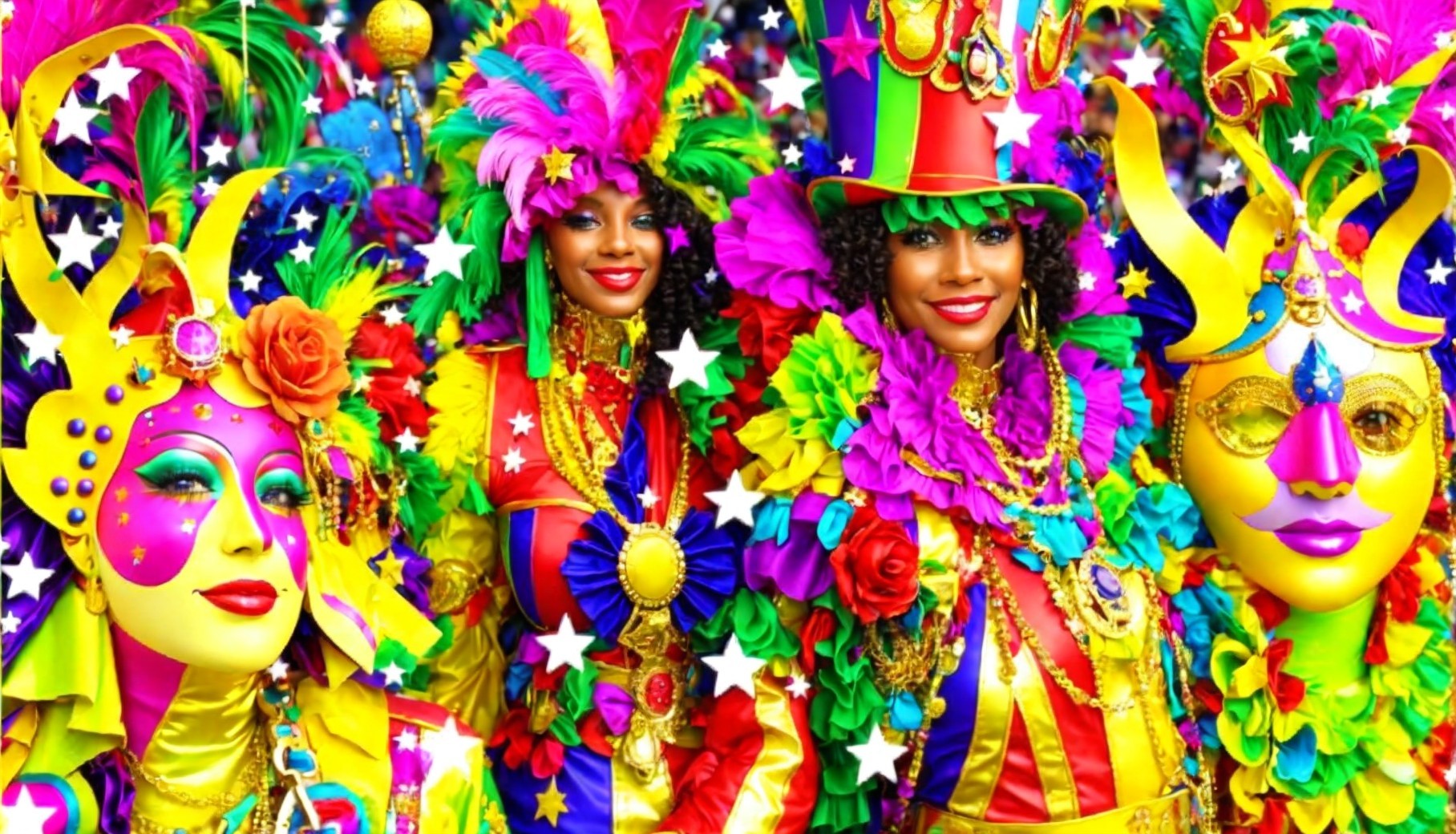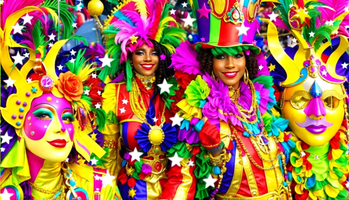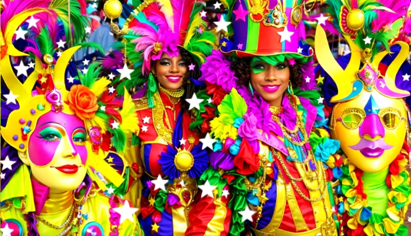 Colorful carnival costumes with masks, feathers, and flowers, embodying vibrant festivity vibes.