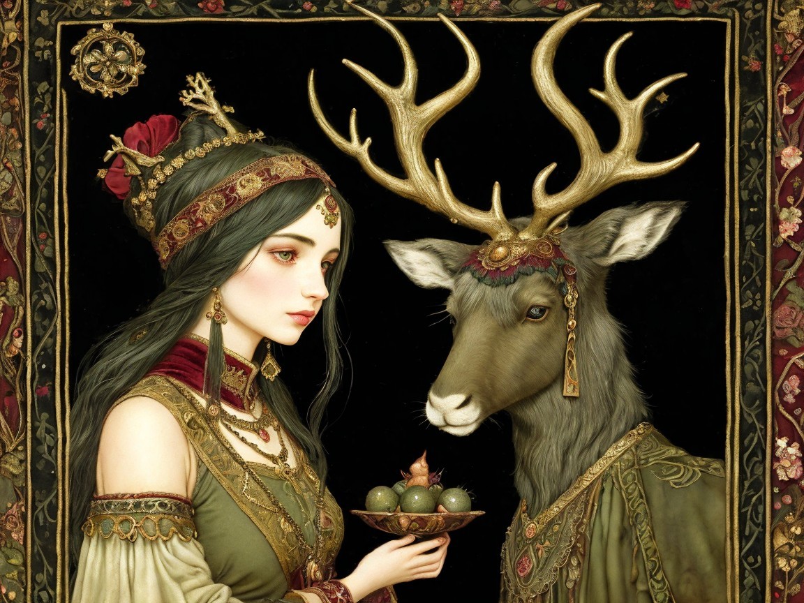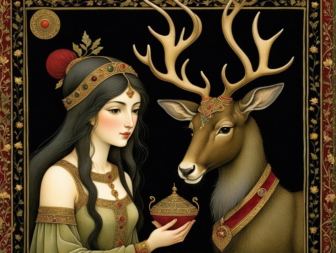 Legend of the girl and the magical reindeer,, 3rd century Persian miniature art. Velvet Black, Shabby, Dull Gold, olive green, burgundy, Golden Ratio, Surreal Fantasy, Elegant, High Definition Ultra Fine 3D Line, Zenangle Style, Watercolor Patchwork , Arthur Rackham Style, Paul Kidby, Gediminas Prankevicius, Jacek Jerka, Extremely Detailed, Intricate, Thoughtful, HDR, Fractal, Beautiful, Award Winning, Fantasy Look, Fantasy, Crisp Quality