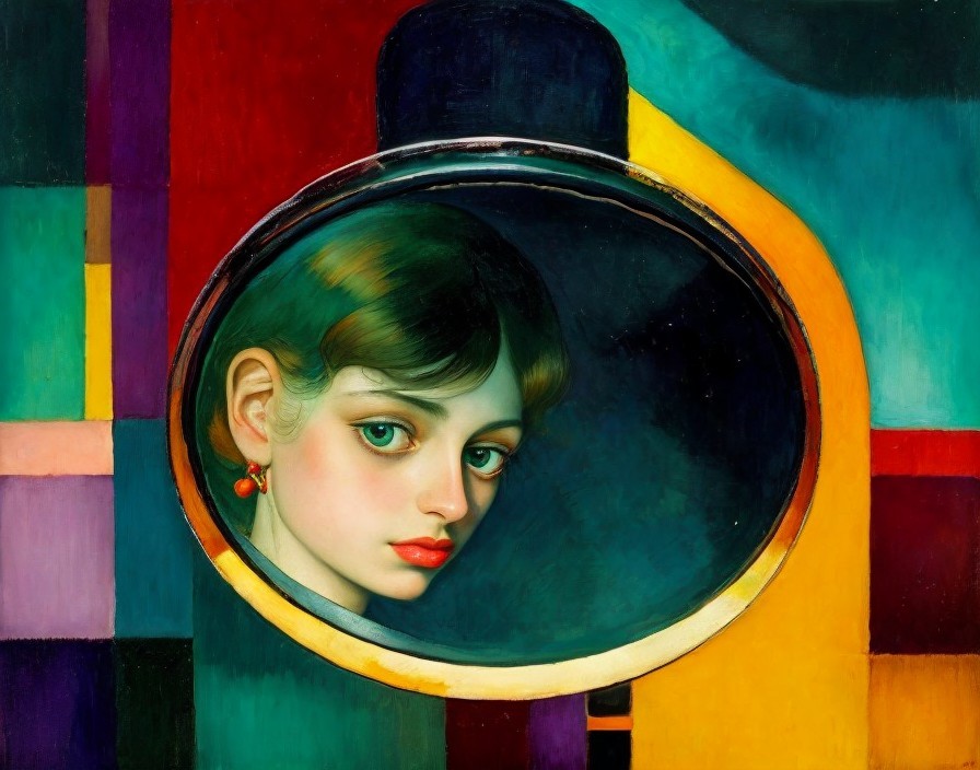 A surreal portrait of a woman's face framed by geometric shapes and a large circular halo, with vibrant blocks of color in the background.