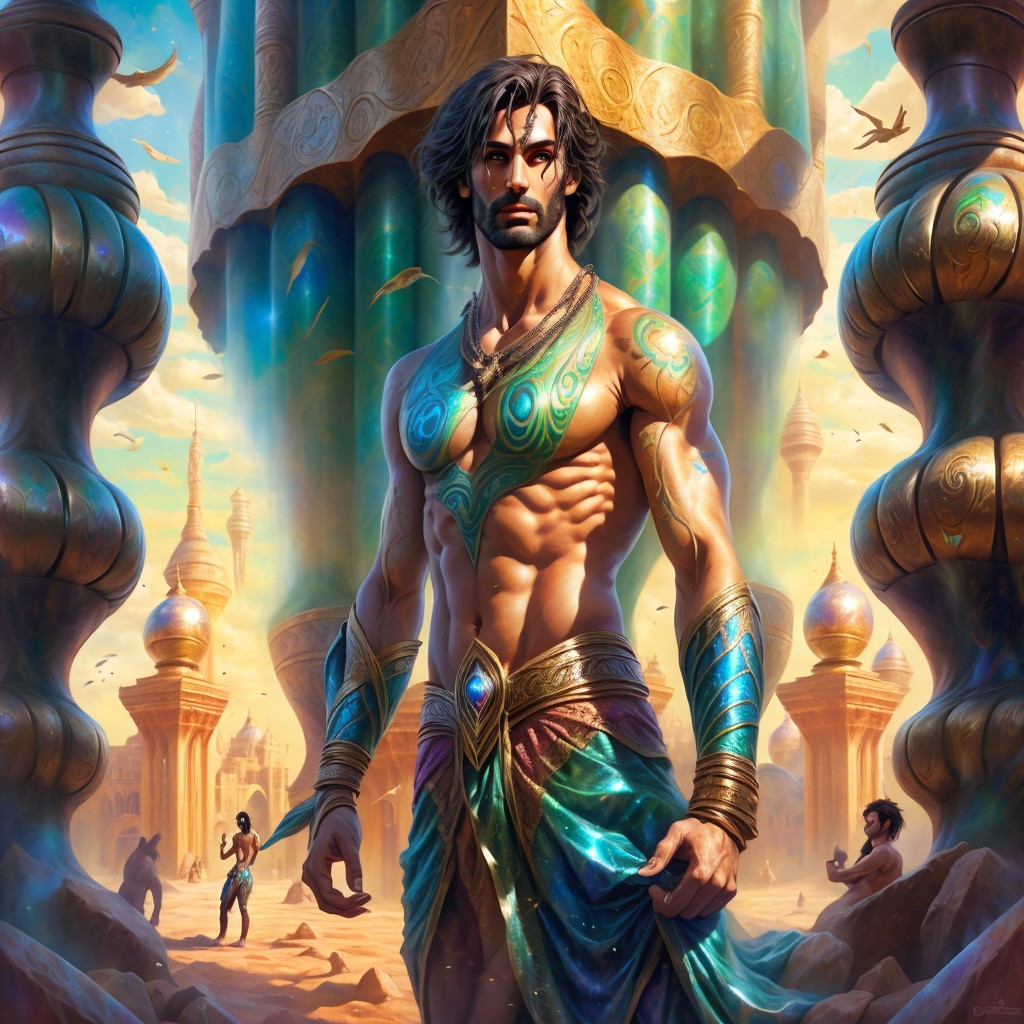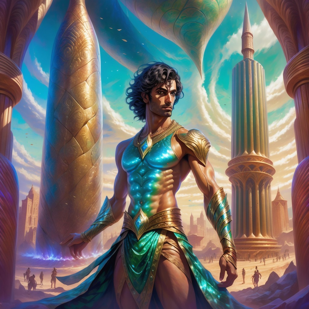 A futuristic scene featuring a heroic figure in shimmering armor, surrounded by colossal, glowing orbs and striking architectural structures, set against a desert landscape.