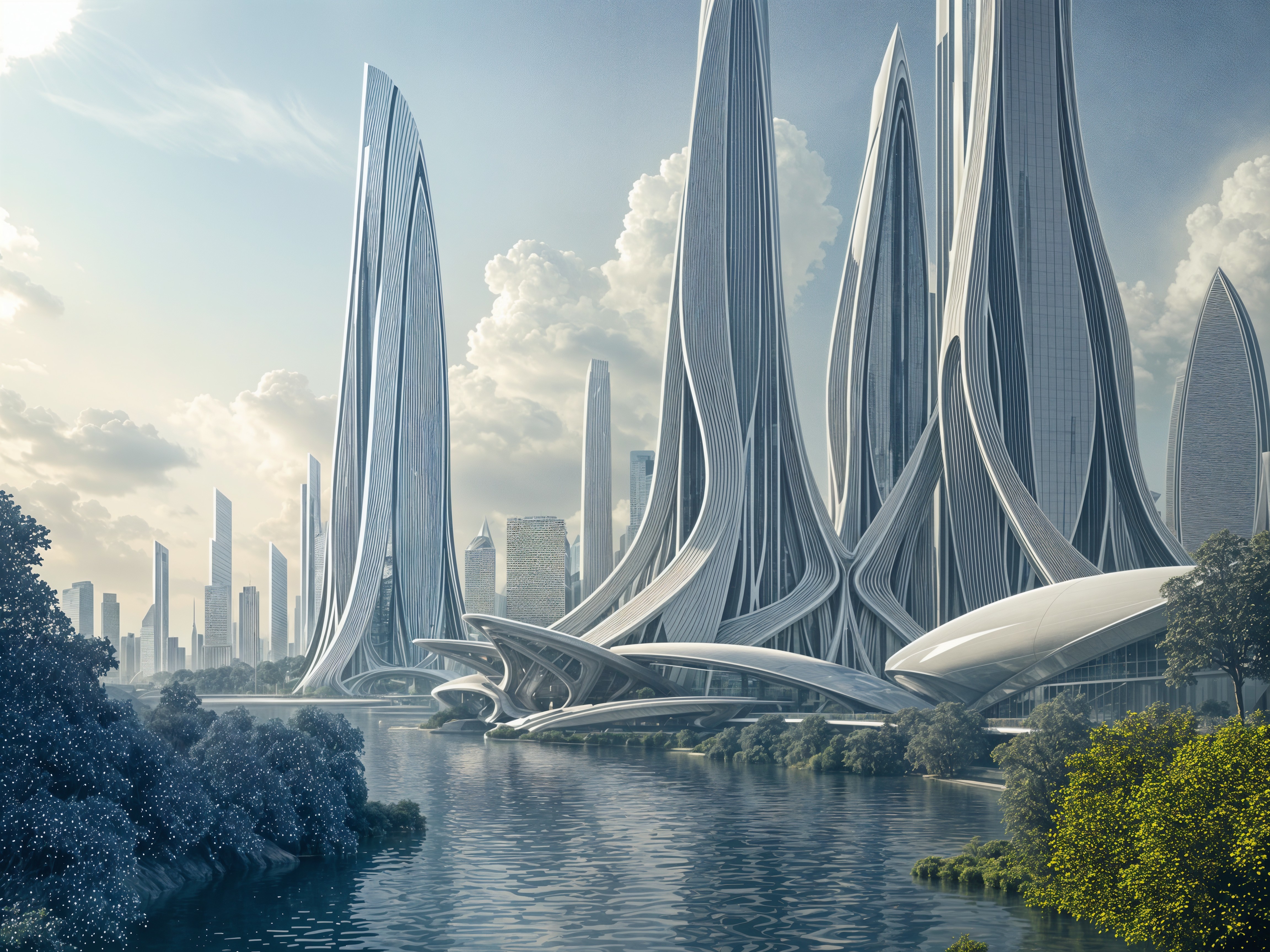 A futuristic cityscape with sleek, towering skyscrapers featuring fluid, wave-like designs. Lush greenery and vibrant flowers line a tranquil river, reflecting the innovative architecture.