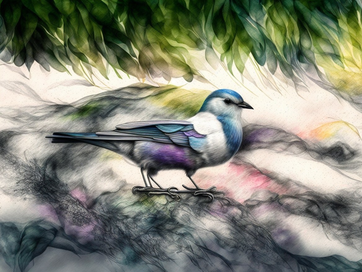 A colorful digital artwork of a bird perched on a branch with vibrant leaves in the background.