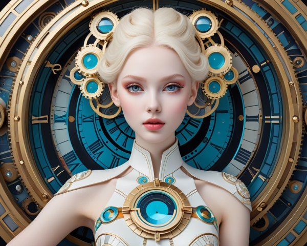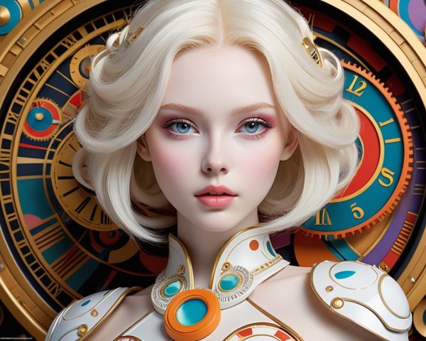 A futuristic figure with pale skin and an elongated face features large, vivid eyes and intricate cheek patterns. Their hair, a vibrant mix of whimsical shapes, complements ornate, artful attire. The backdrop showcases surreal architecture and floating orbs, creating a dreamlike atmosphere filled with radiant colors and ethereal details.