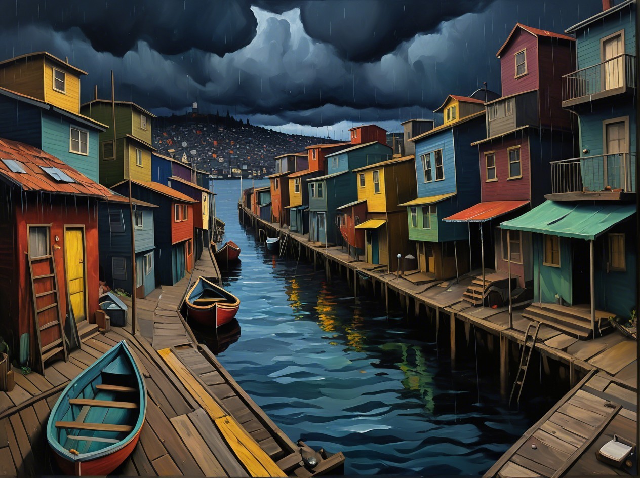 A digital painting in the style of expressionism depicts a colorful port city with a dramatic rainstorm. The vibrant houses of various colors including red, orange, blue, green, yellow, and purple are perched on wooden docks that line a winding canal or river. In the foreground, a teal and red
