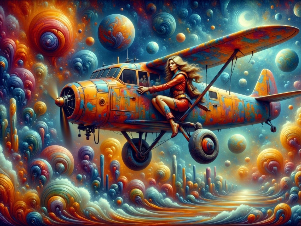 A woman in a vintage biplane flies through a vibrant cosmic landscape, surrounded by planets and clouds, with a distant castle on a rocky terrain, blending retro aviation and surreal space elements.