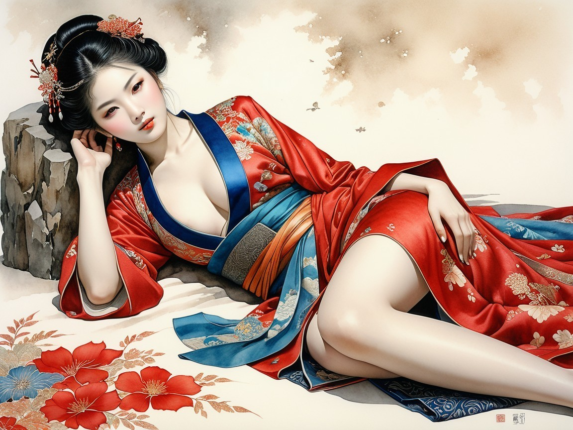 A graceful figure in a vibrant red kimono adorned with floral patterns reclines against a rock. The serene background enhances the elegance and beauty of the scene.