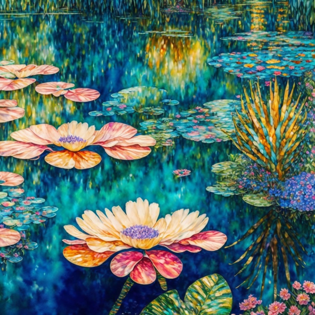 Prompt: "Full page, single image, fantastic wide view, 3D watercolor patchwork, in the very best style of Gustav Klimt of an azure-colored rippling pond reflecting a beautiful [Tingatinga style garden with tropical flowers in multiple vibrant spectacular colors, many palm trees, and plants with delicate leaves in shades of turquoise and teal and gold], golden sunrise rays shimmering over the scene, detailed intricate, satiny, high quality, elegant, highly detailed, glistening magic style with elements in the style of Jan Toorop"