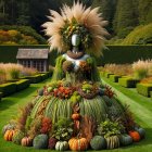 A stunning mannequin dressed in a gown made of natural materials, featuring intricate layers of grasses and floral accents, set against a lush backdrop of tall grass and trees.
