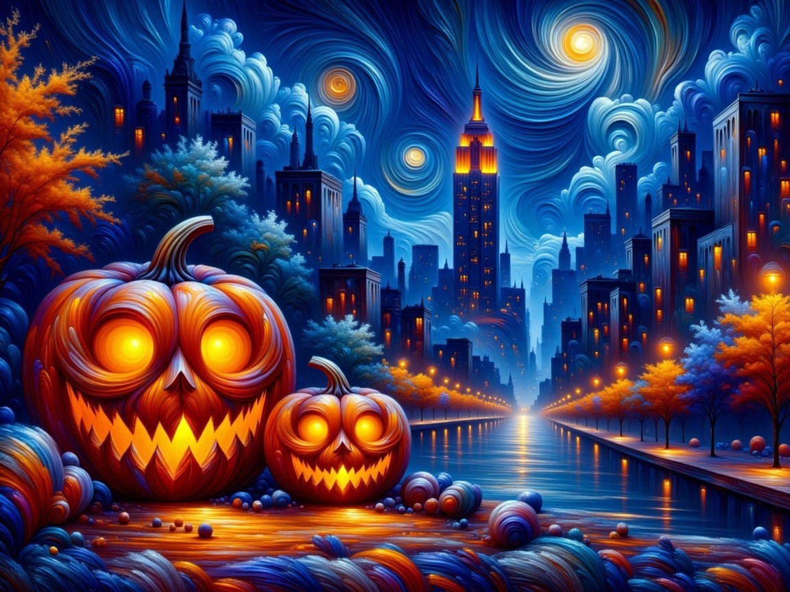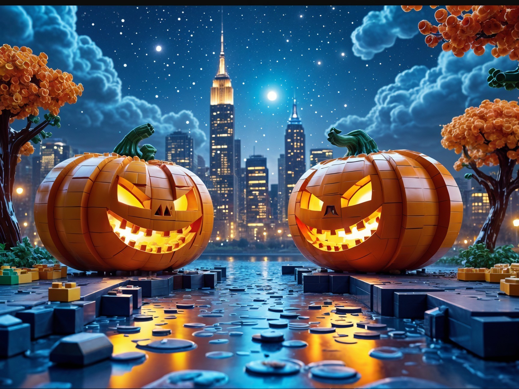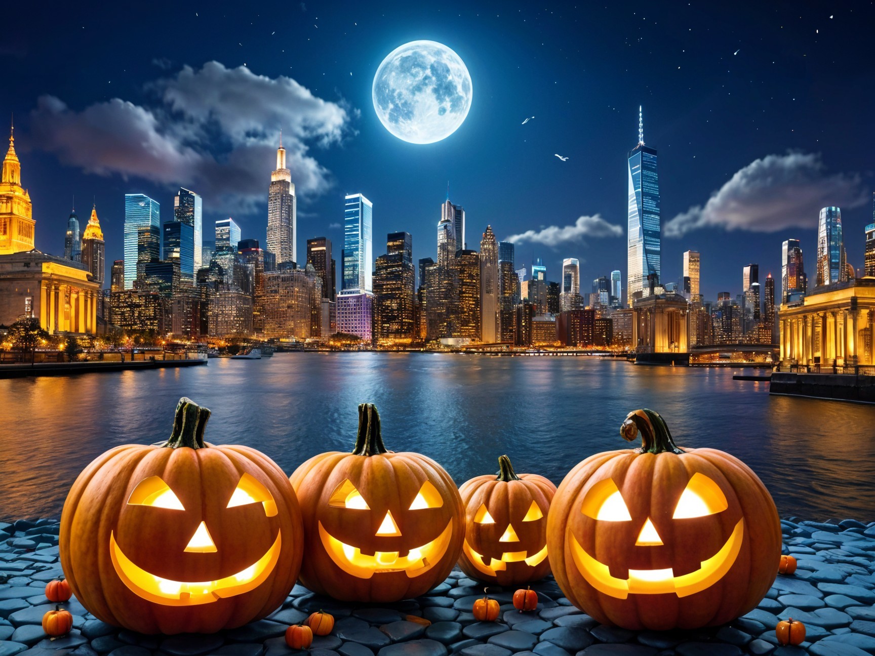 A vibrant Halloween scene featuring glowing jack-o'-lanterns by a shimmering waterfront, set against a dramatic skyline enveloped in swirling clouds and a bright full moon.