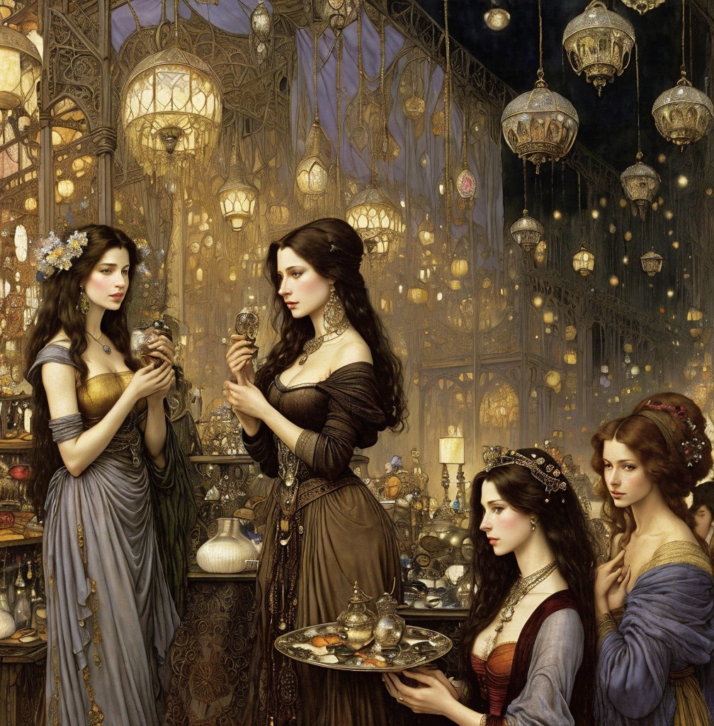 In a dimly lit antique shop, four elegant women in vintage gowns examine ornate objects. The setting is rich with vintage decor, creating a mysterious and nostalgic atmosphere.
