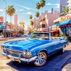 A vibrant blue classic 1961 Chevrolet Impala Convertible shines under a sunny sky, palm trees lining a picturesque street with pastel buildings in the background, evoking a laid-back, retro vibe.
