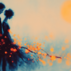 Prompt: A romantic scene featuring a couple, a man and a woman, silhouetted against a dreamy, soft background. The couple stands close together, exuding an intimate vibe, with a warm, glowing sun setting behind them. Surround them with floating, ethereal orbs of light in hues of orange and soft blues, creating a magical atmosphere. The couple is dressed elegantly, adding to the whimsical feel of the artwork. The melancholic style should be painterly and abstract, emphasizing the emotions of love and connection.