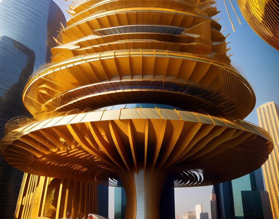 A modern, spiral golden tower with multiple levels, bathed in sunlight against a clear sky, flanked by green foliage.