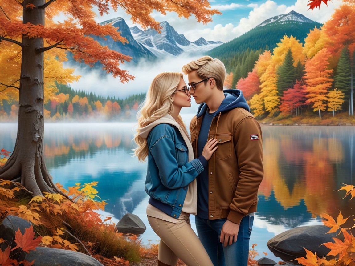 A young couple stands by a serene lake, surrounded by vibrant autumn foliage and mountains. They share a tender moment, gazing into each other's eyes, wrapped in cozy, casual outfits.