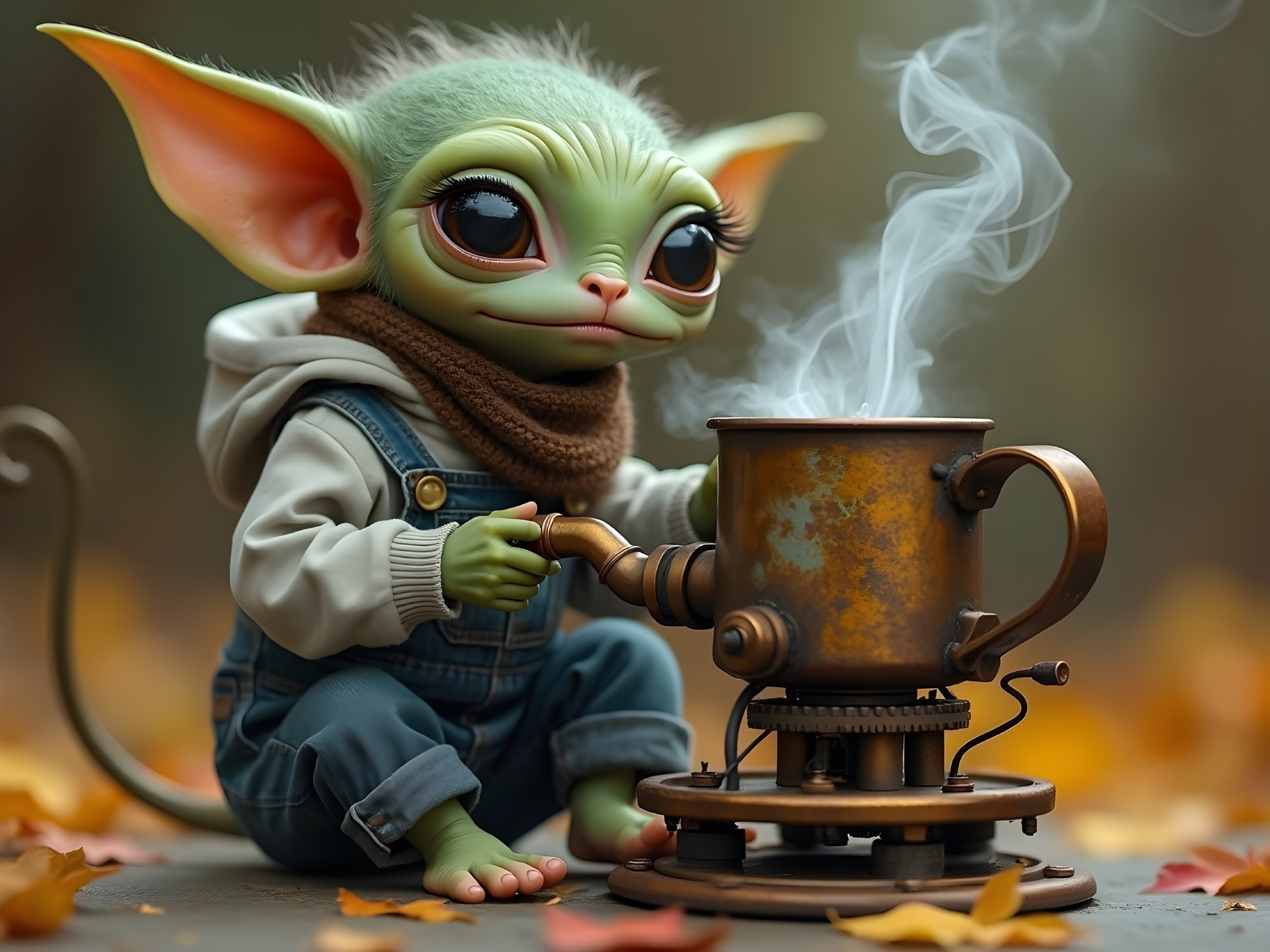 A cute, large-eyed creature with green skin and oversized ears sits beside a steaming metal mug. Dressed in overalls and a cozy scarf, it enjoys the fall ambiance with colorful leaves around.