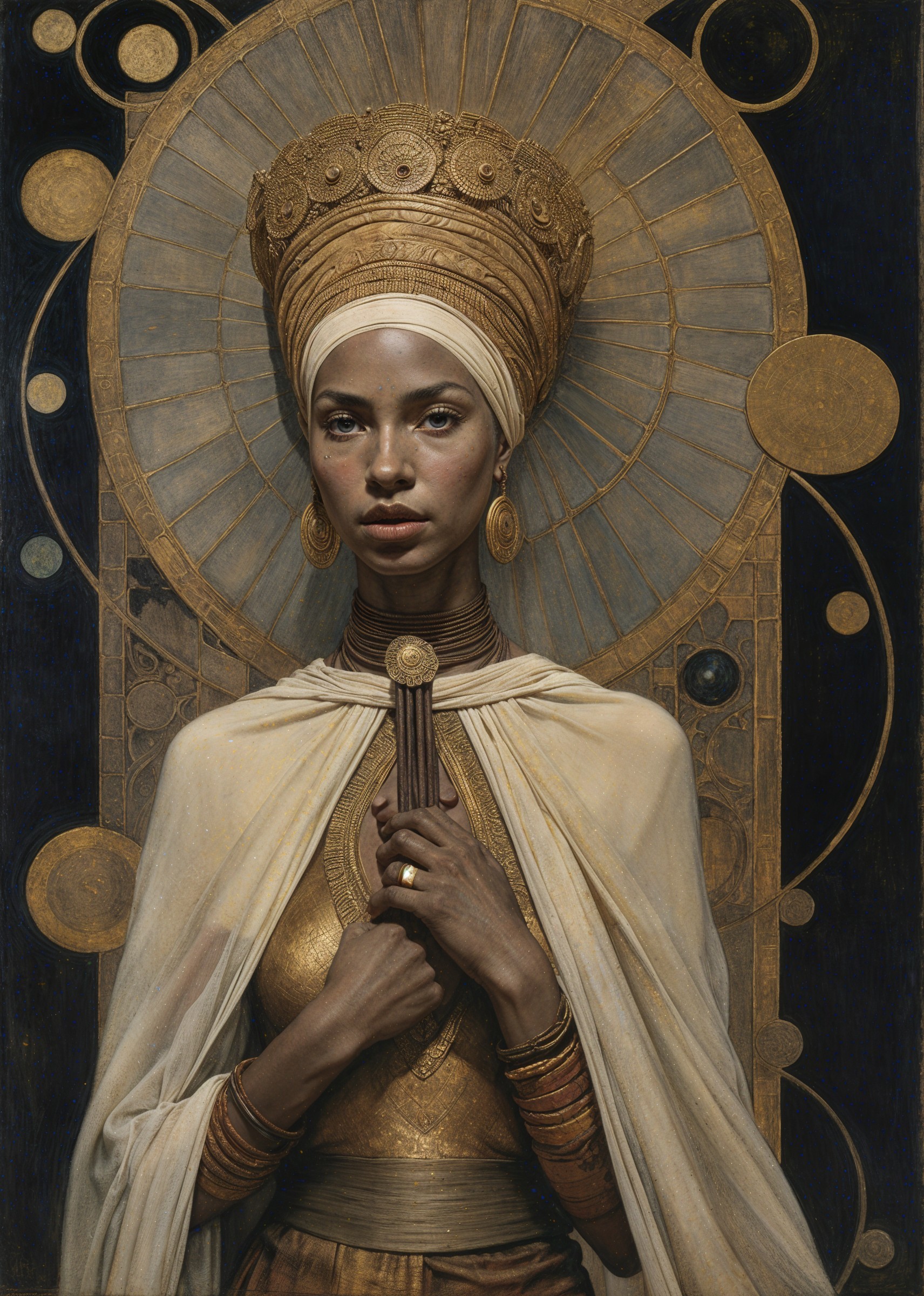 A striking portrait of a woman with a serene expression, adorned in elegant garments and gold accessories. She stands with hands clasped, against a backdrop of rich textures and warm tones.