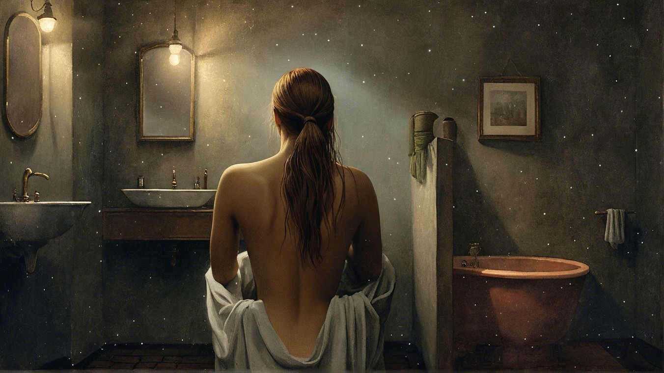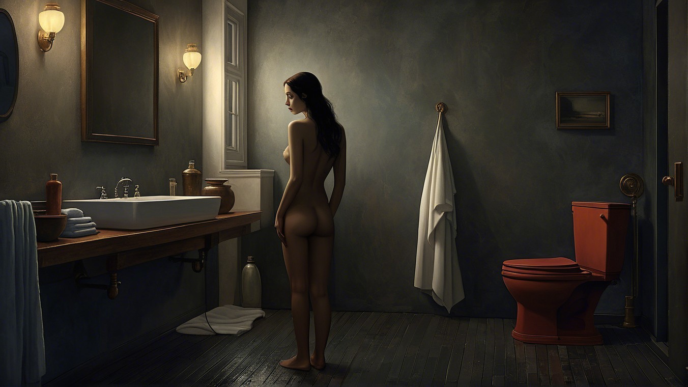 A solitary figure in a long black dress stands near a window in a dimly lit room. A wooden table holds books and a vase of flowers, while a red upholstered chair adds a touch of color.