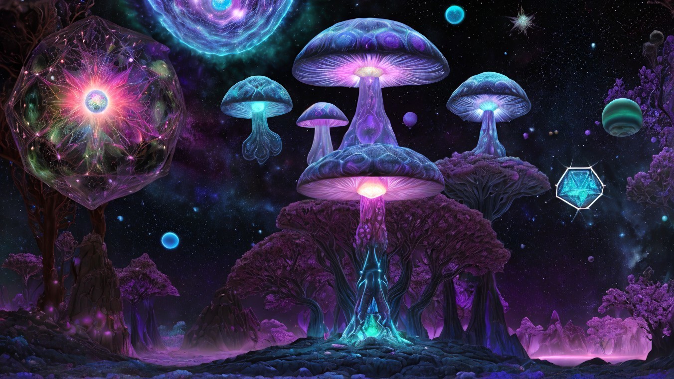 A vibrant digital artwork featuring cosmic jellyfish and mystical symbols set against a starry space backdrop with planets.