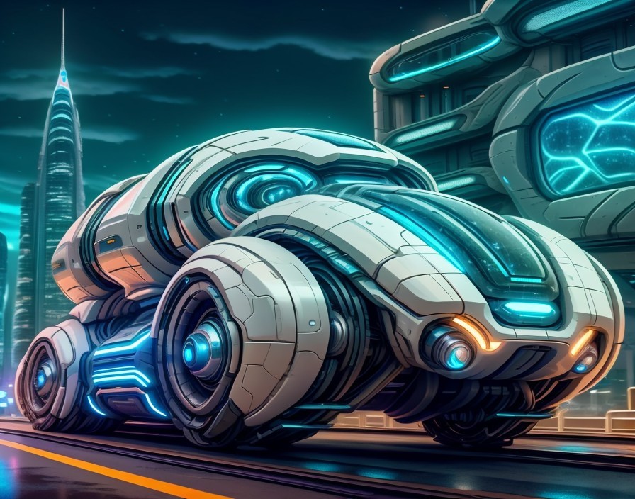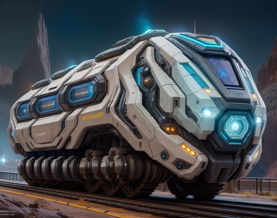 Prompt: futuristic train with multiple carriages, inspired by the textures of buildings and crystals, racing through a cityscape under the cosmic night sky. Envision the train with sleek and intricate details resembling the textures of futuristic structures and crystalline formations, extending gracefully with multiple carriages for an elongated composition. The background should feature futuristic cities with vibrant lights, blending seamlessly into the celestial expanse of outer space. Include a futuristic railway system with tracks that have a technologically advanced design, complementing the overall aesthetic. Introduce a mech escorting or integrated into the train, adding an element of advanced technology and protection. Capture the dynamic movement and fusion of technology, architecture, and cosmic beauty in this futuristic, elongated train-themed masterpiece