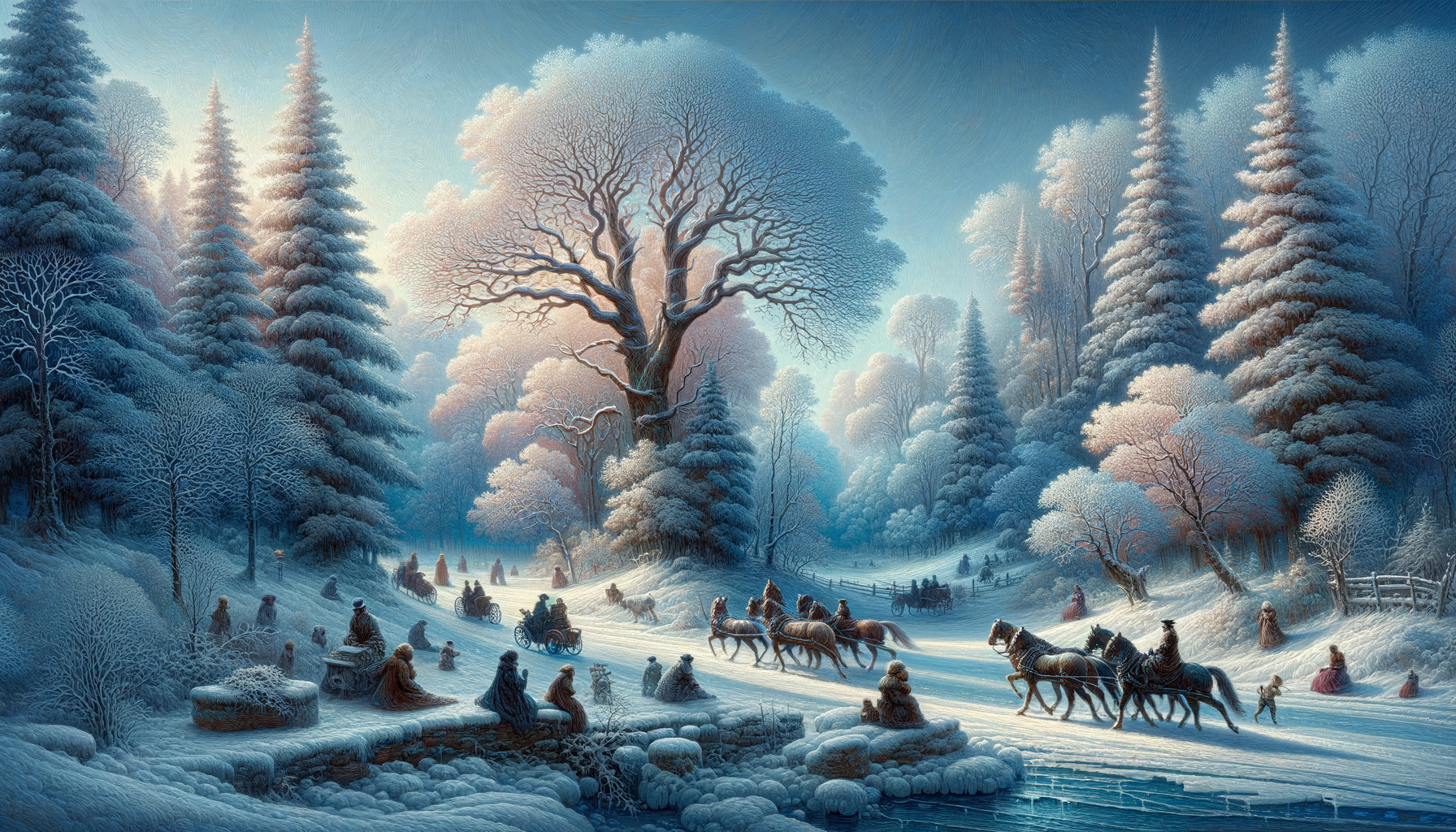 Snow-covered trees and crescent moon in serene winter night scene