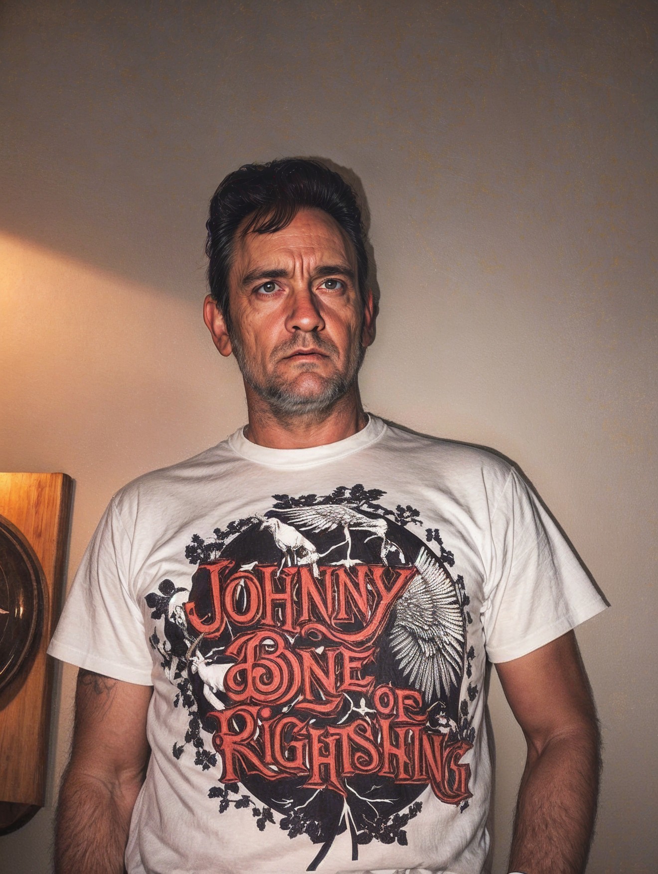 A solemn man stands in a desert landscape, wearing a graphic tee featuring a tree. He holds a cheeseburger, contrasting the serene surroundings with a touch of humor. The sky is dramatic, hinting at sunset.