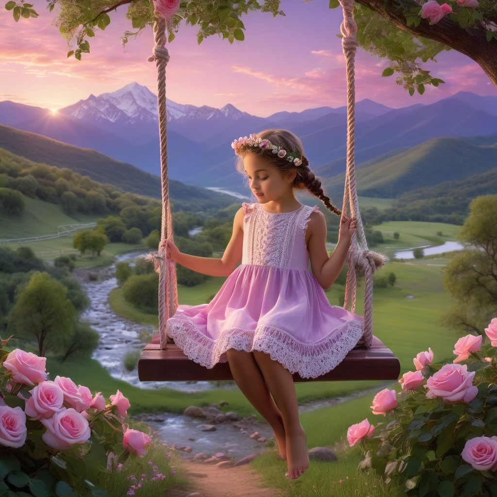 A girl in a white and pink dress sits on a swing amidst roses with mountains and a sunset in the background.