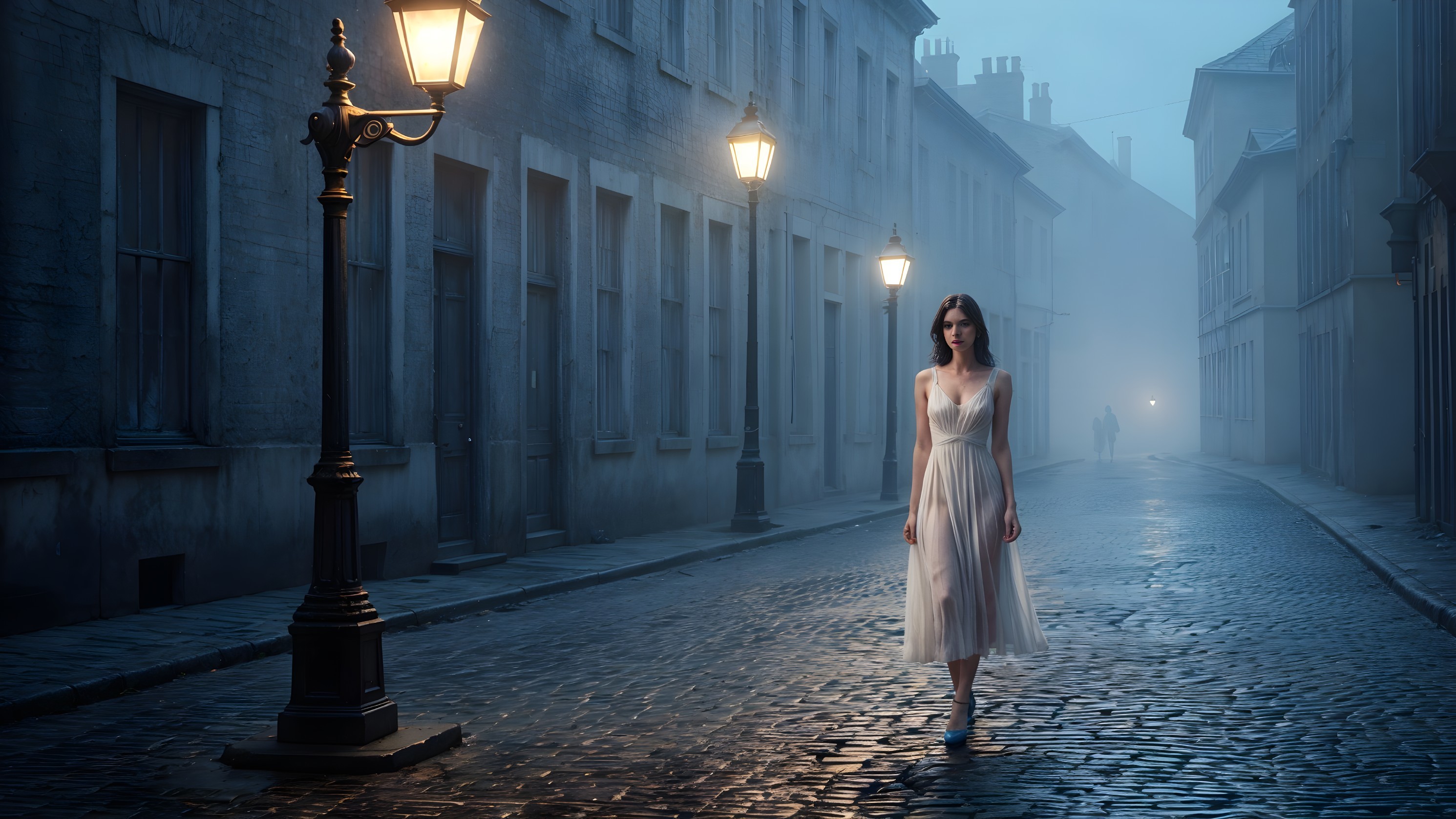 A woman in a flowing dress walks alone down a misty cobblestone street, illuminated by vintage streetlamps, creating an atmospheric and mysterious scene.