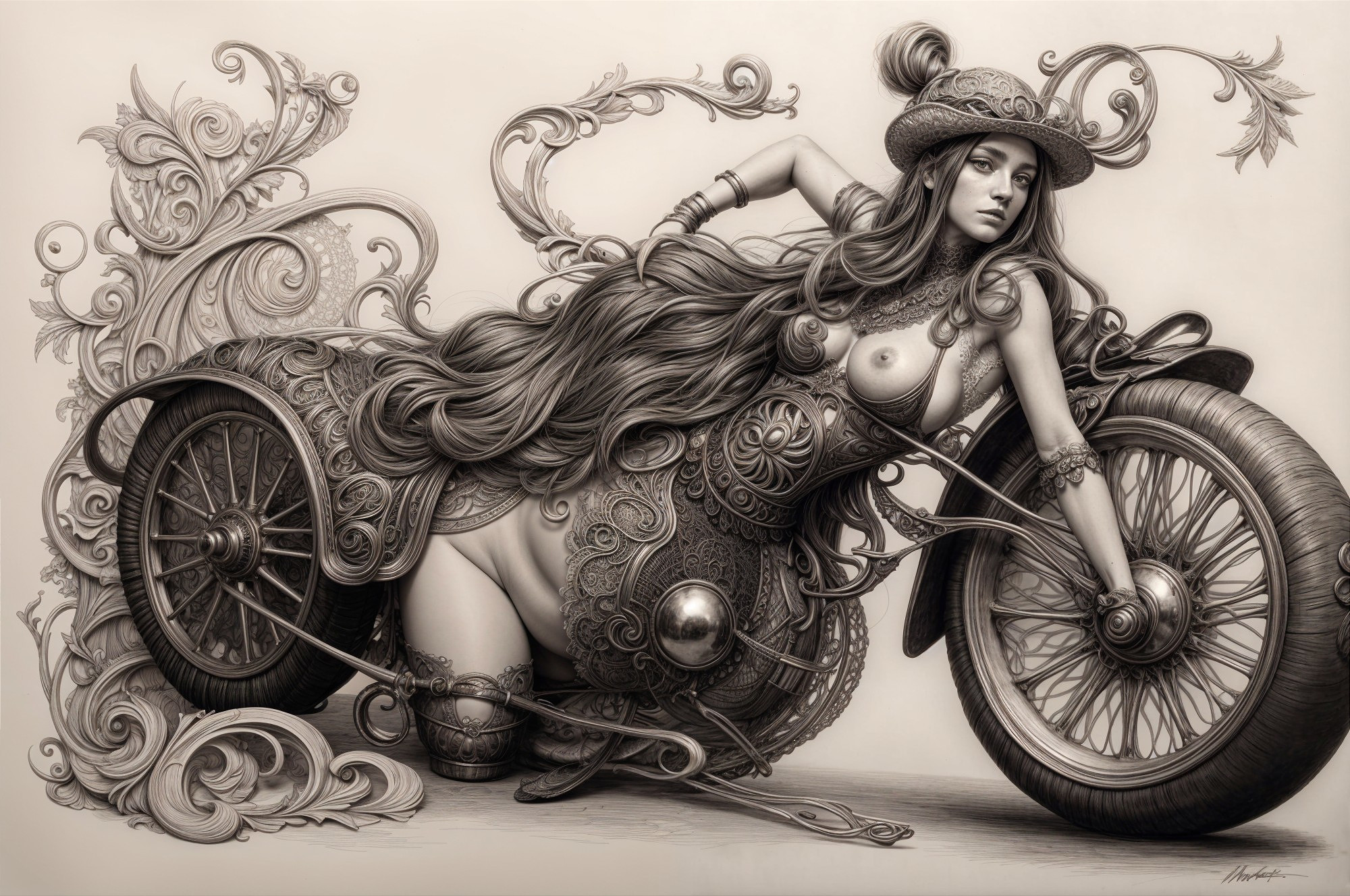 A detailed, imaginative illustration featuring a woman with long hair, dressed in ornate armor, reclining on a stylized motorcycle surrounded by intricate floral patterns.