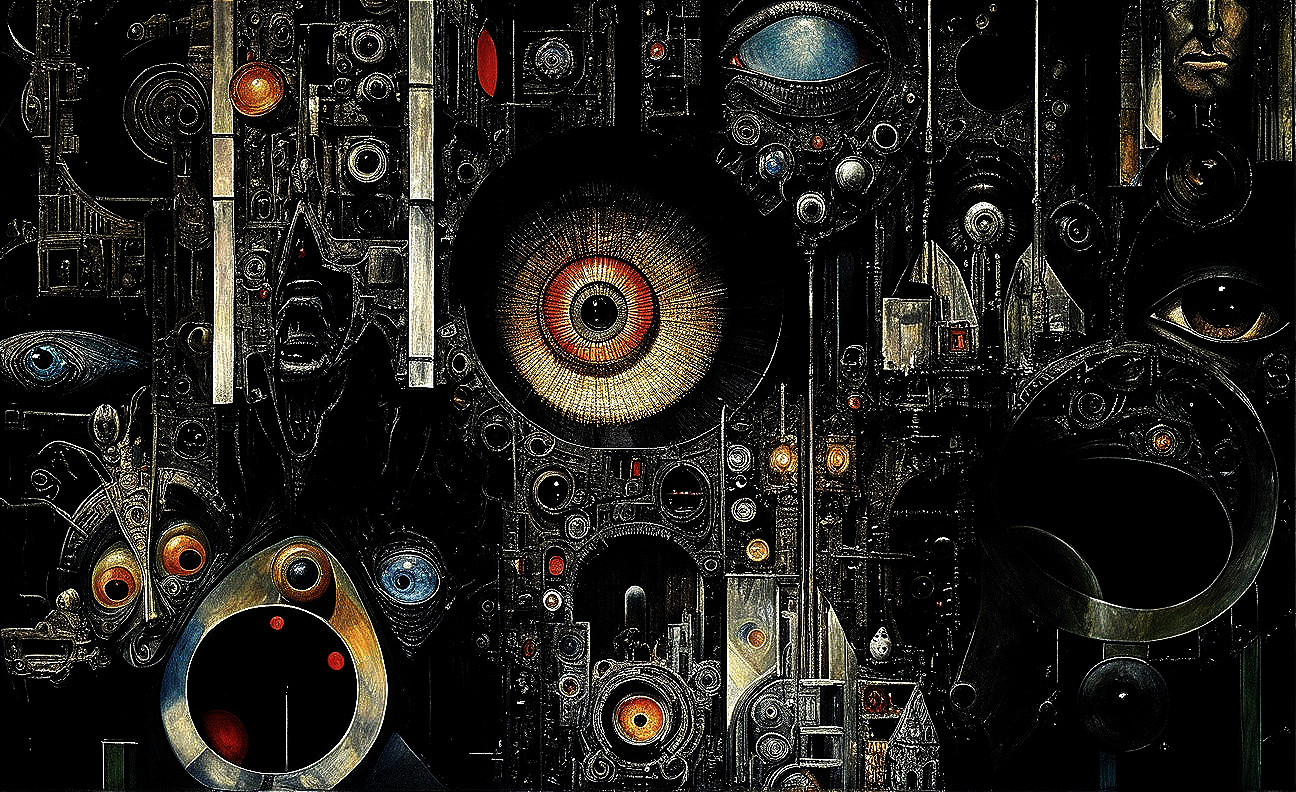 The image features a dark, intricate composition with a sculpted face merging with mechanical elements. Various eyes and circular designs create an eerie, surreal atmosphere.