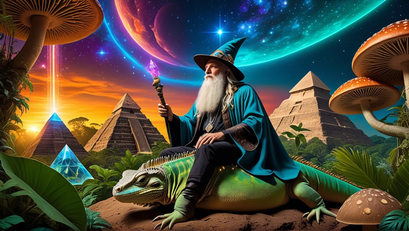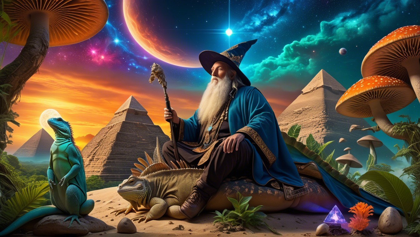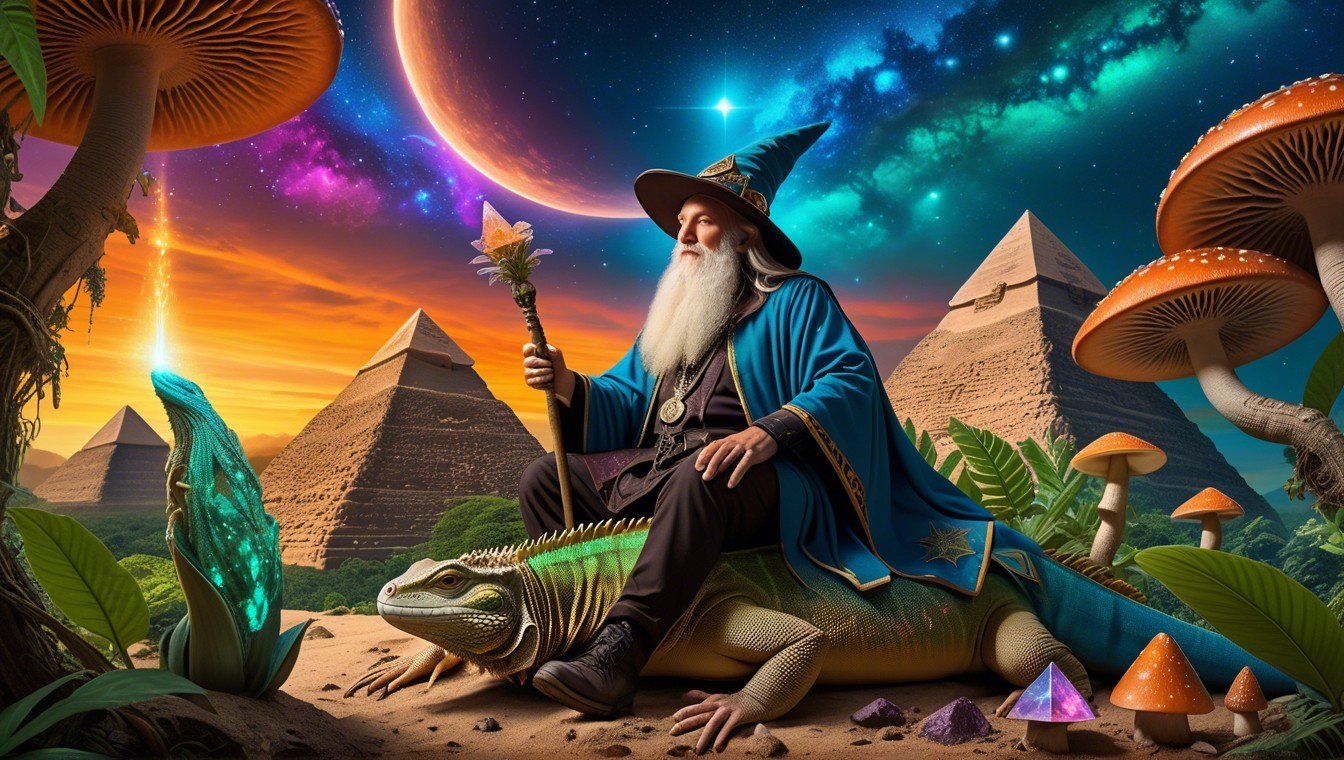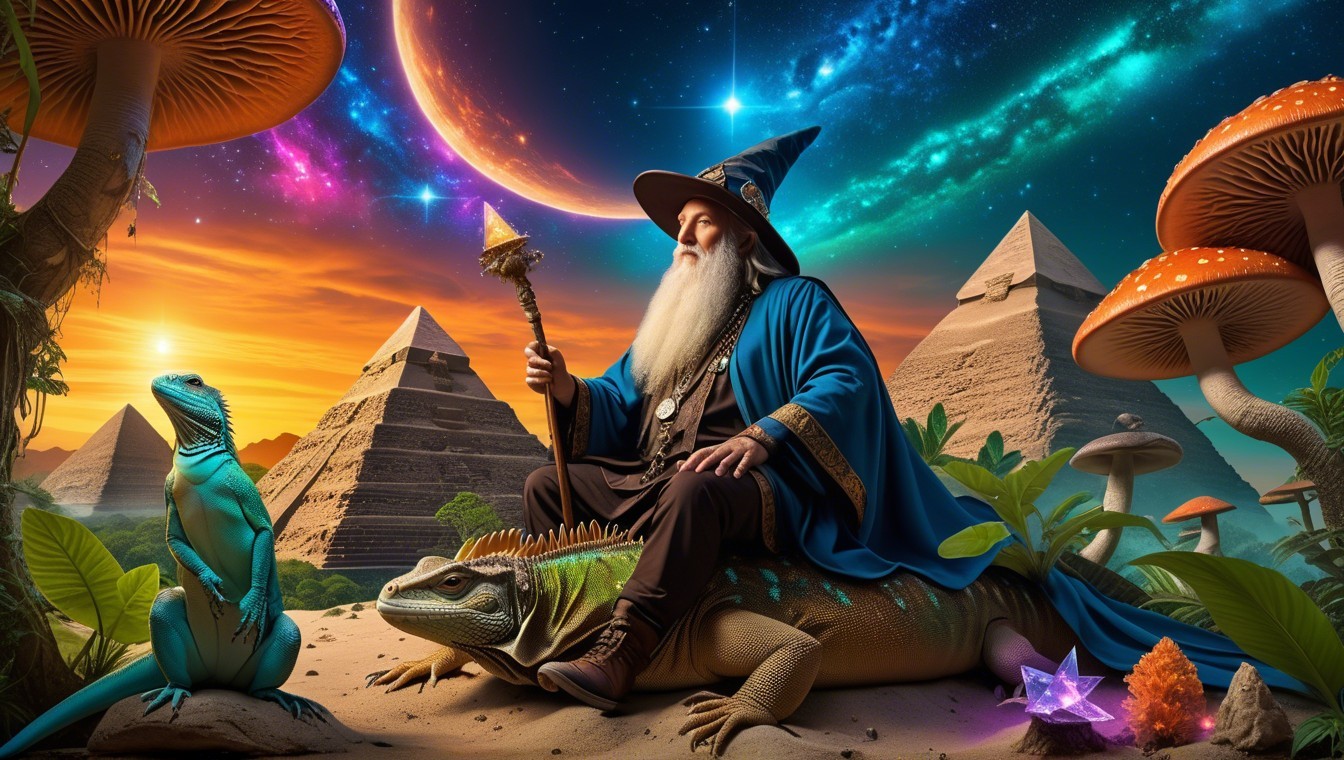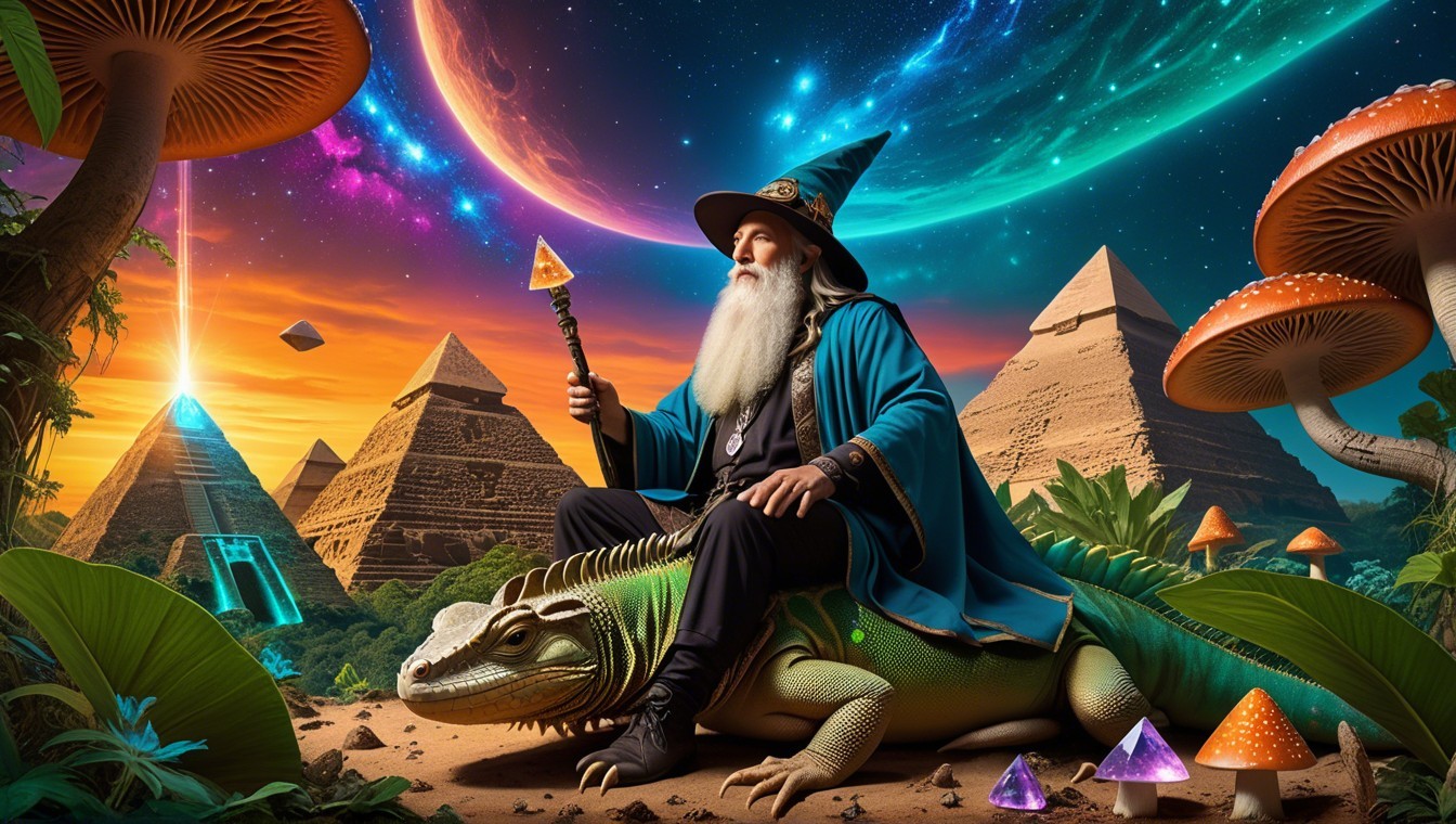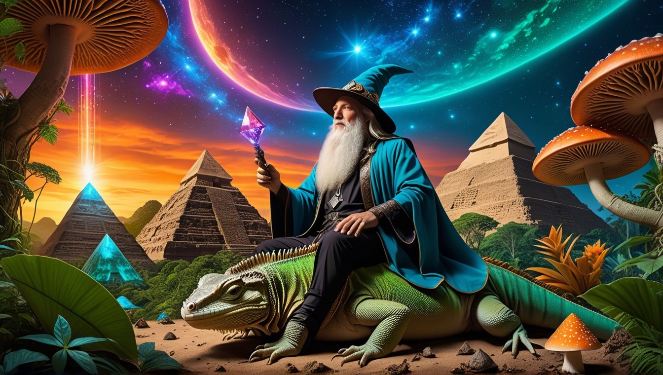 A wizard in a blue robe sits on a large lizard in a fantastical landscape, surrounded by giant mushrooms, pyramids, and vibrant planets, casting a glowing spell with his wand.
