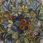 The image features a beautifully crafted glass vase adorned with intricate hand-painted leaves in vibrant autumn colors, showcasing rich reds, oranges, and greens against a dark background.