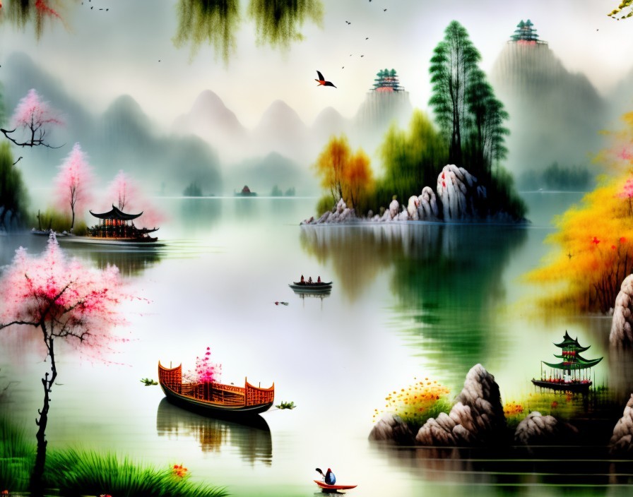 A serene illustration of a misty lake with boats, surrounded by lush mountains, a blossoming tree, and a traditional pavilion.