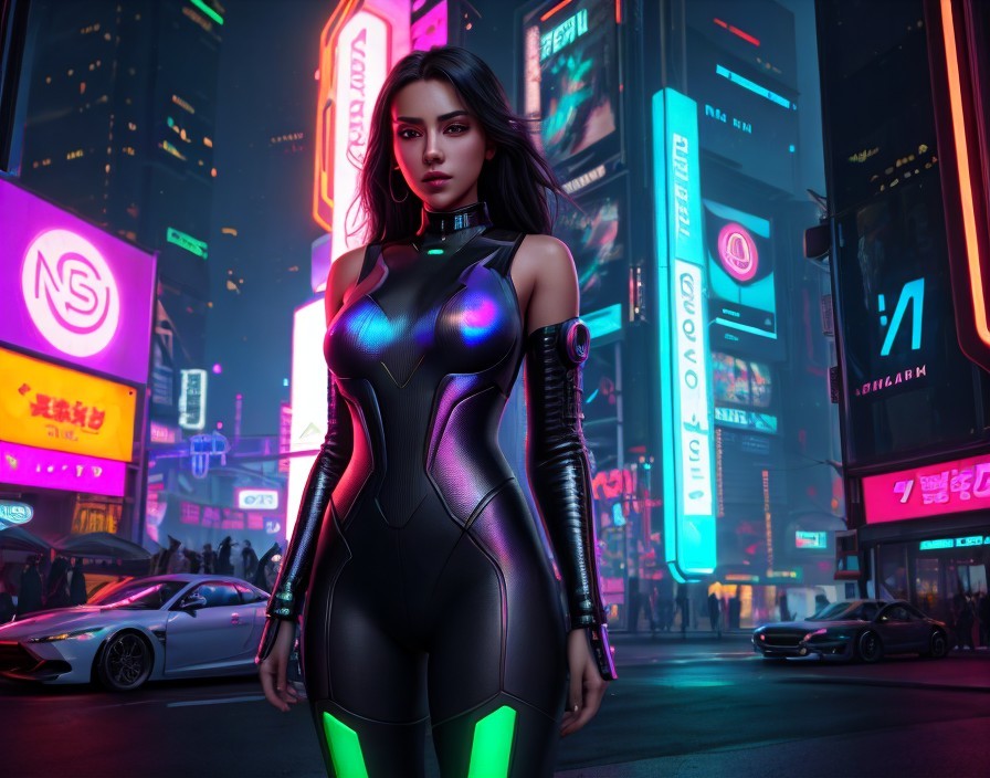 A beautiful woman stands alone in the reflected lights of this vivid cyberpunk setting. She has what it takes to survive despite everything she has been through in this dark future.