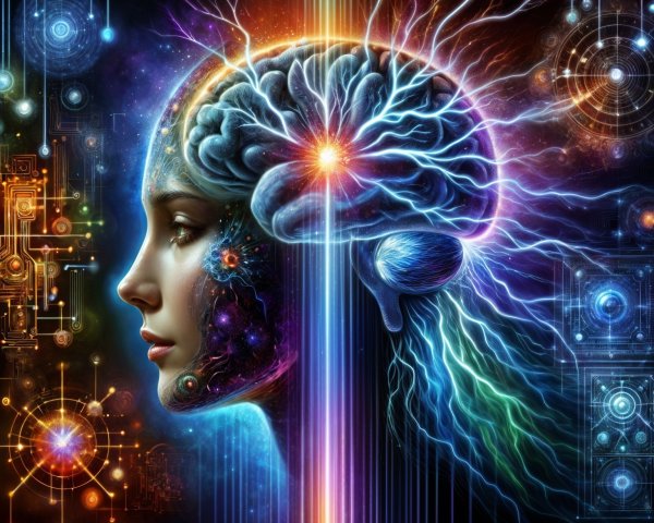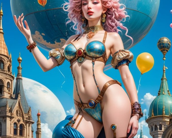 A serene young woman in a traditional kimono stands by a riverbank, adorned with flowers in her hair. The backdrop features a picturesque bridge and a beautiful cityscape at sunset.