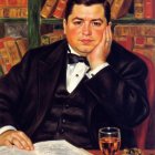 A cheerful LEGO character in a tuxedo sits at a colorful desk, reading a book with a glass of drink nearby, surrounded by vibrant bookshelves and scattered golden studs.