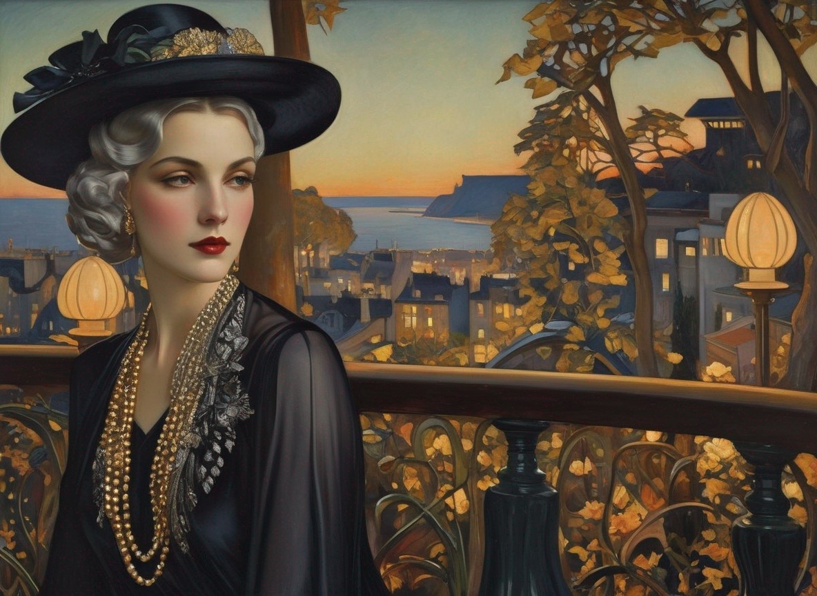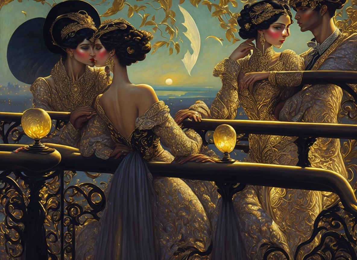 Two elegant women in vintage attire converse on a balcony with a scenic sunset and cityscape backdrop.