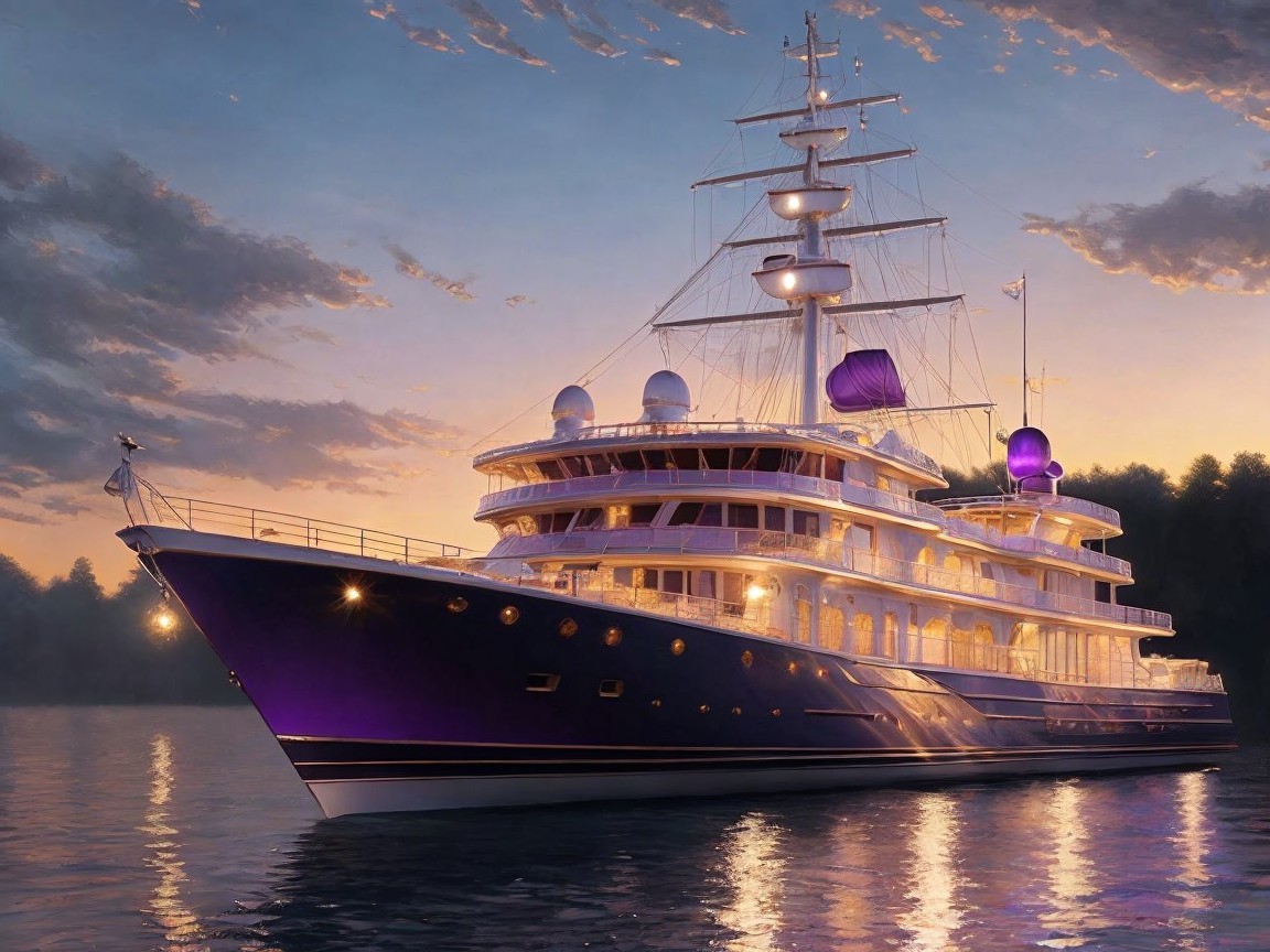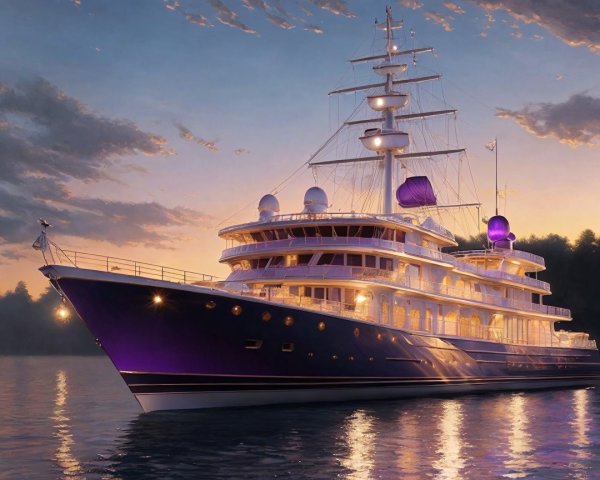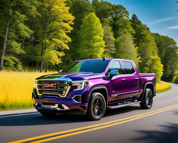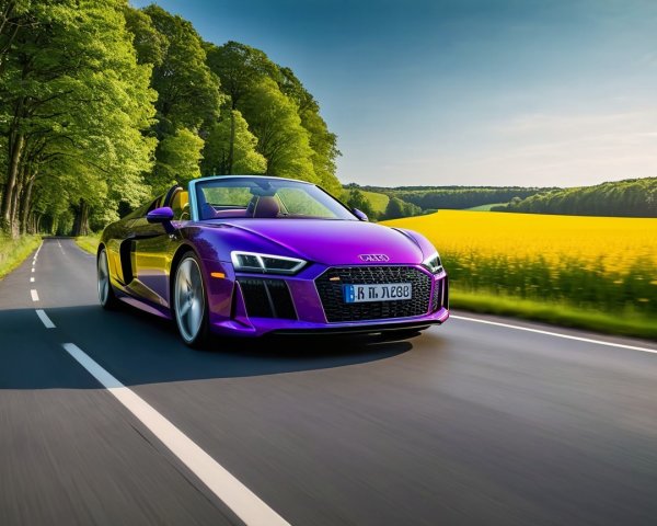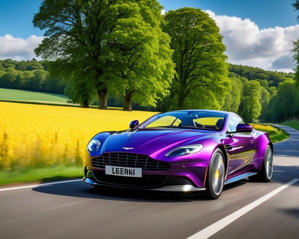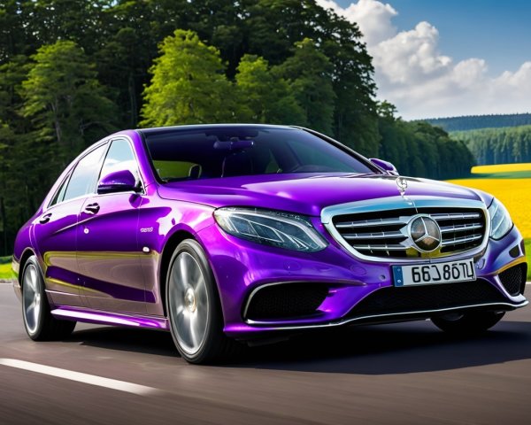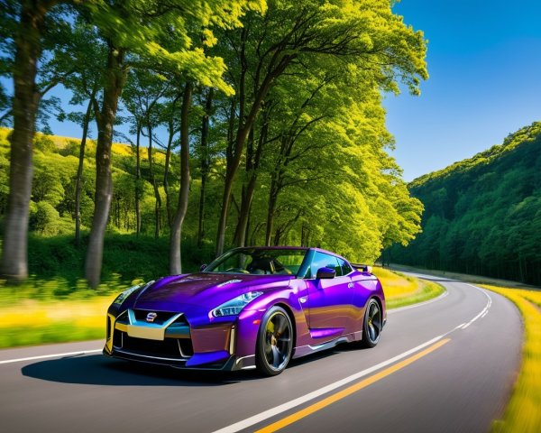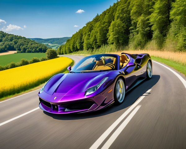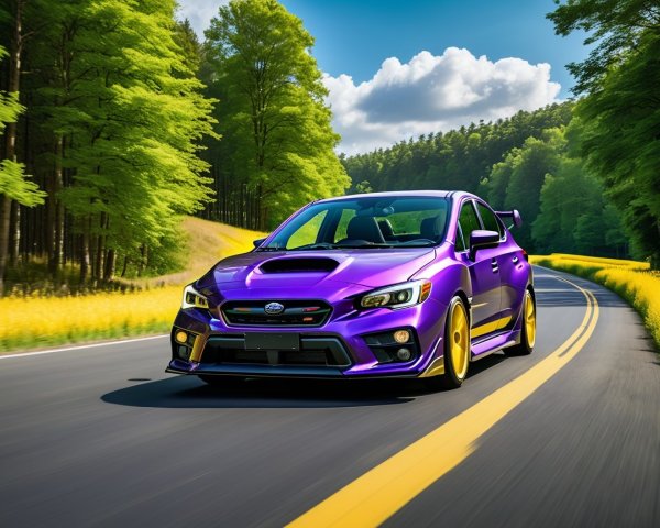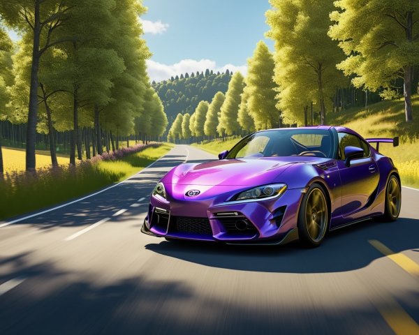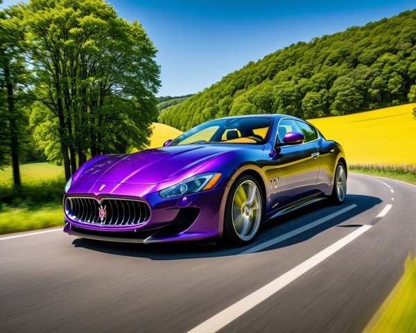 A vibrant purple BMW M5 speeds along a scenic road, flanked by lush green trees and fields of yellow flowers. The sun shines brightly, enhancing the car's sleek design and dynamic presence.