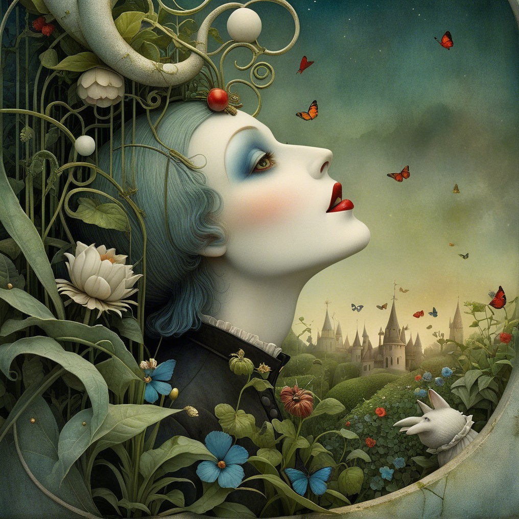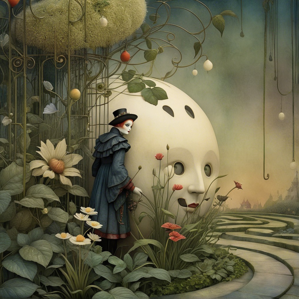 Close up, impish devious Pierrot creature in a garden maze, in the style of Alexander Jansson. by Catrin Welz-Stein, Michael Parkes