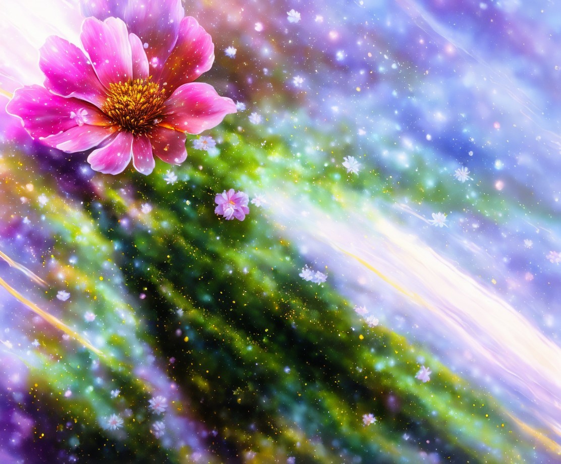A vibrant painting of a blossoming field with pink and white flowers against a soft, pastel-colored background.