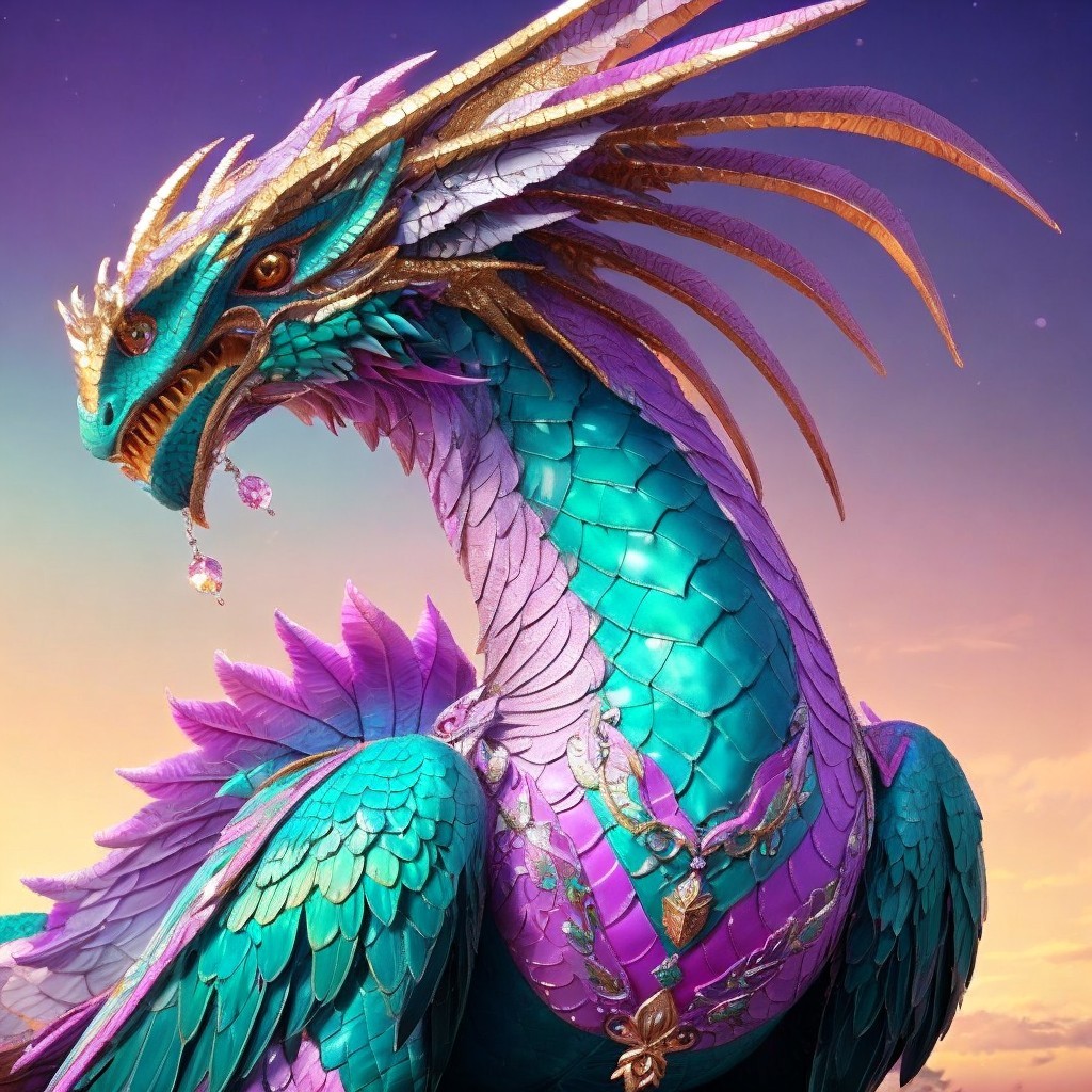 A majestic dragon with vibrant turquoise and purple scales, adorned with golden accents and shimmering gemstones. Its regal wings and intricate details create a striking, enchanting presence.